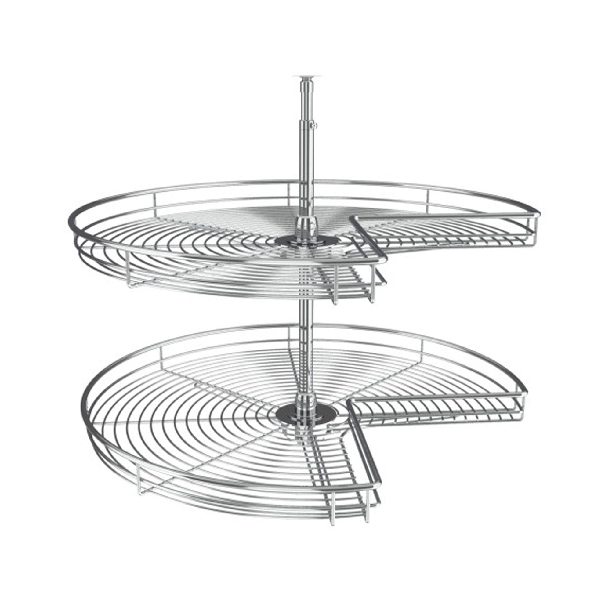This lazy susan unit is designed to fit in your corner base cabinet, featuring 2 Kidney-Shaped shelves that retain the corner's wedge shape and won't extend out into your floorspace. Durable rotating hardware and a telescoping shaft make installation simple, allowing you to rotate each shelf independently to find what you're looking for. This 2-shelf system is made of steel wire with a polished chrome finish to protect against scratches and rust. Organize cereal, baking supplies, spices, pots, pans, lids, and more, and get the most out of your deep corner cabinet's space.