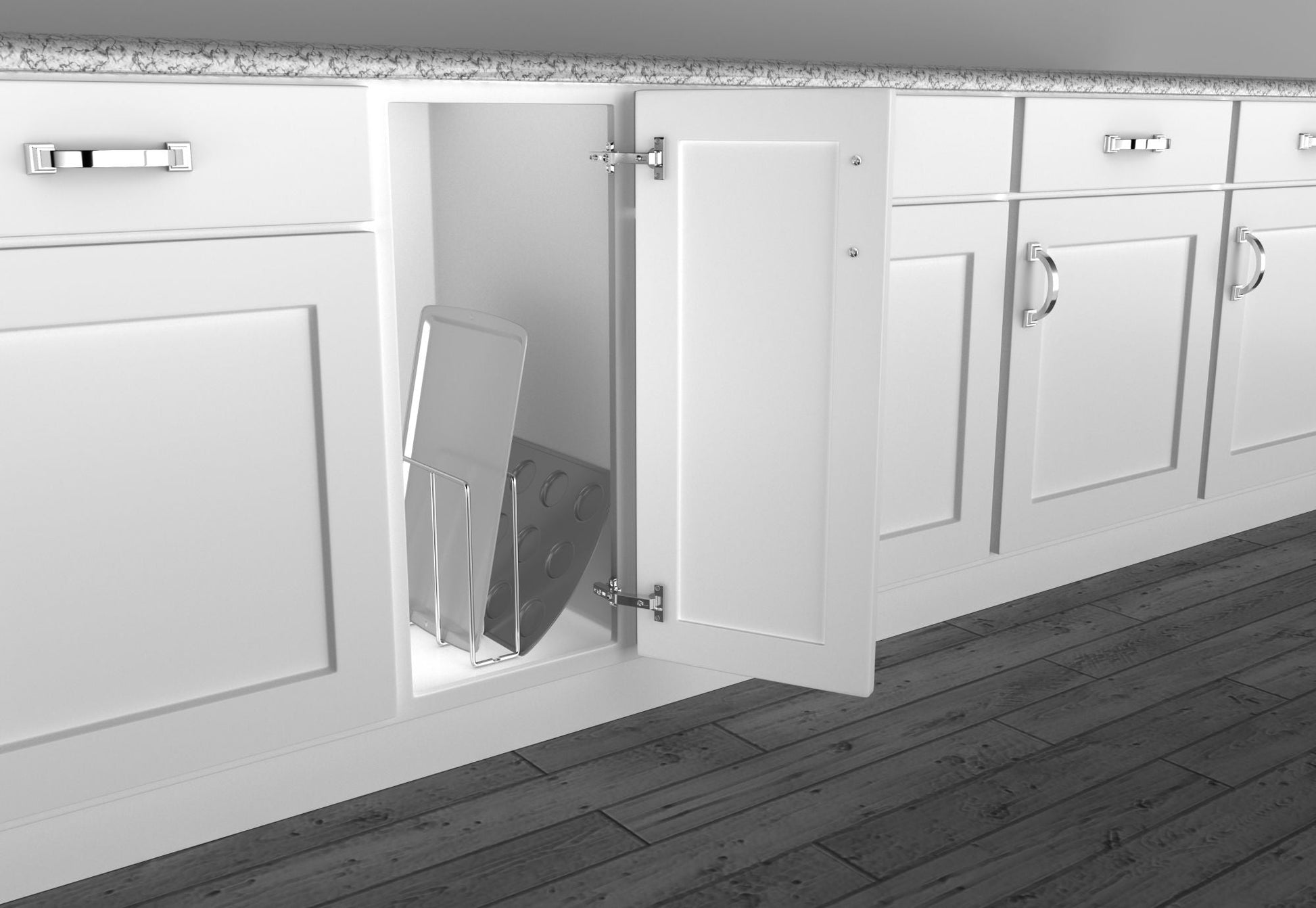 - Baking sheet organizer for wall and base cabinets to improve the storage capabilities with U-shaped metal dividers for organizing bakeware