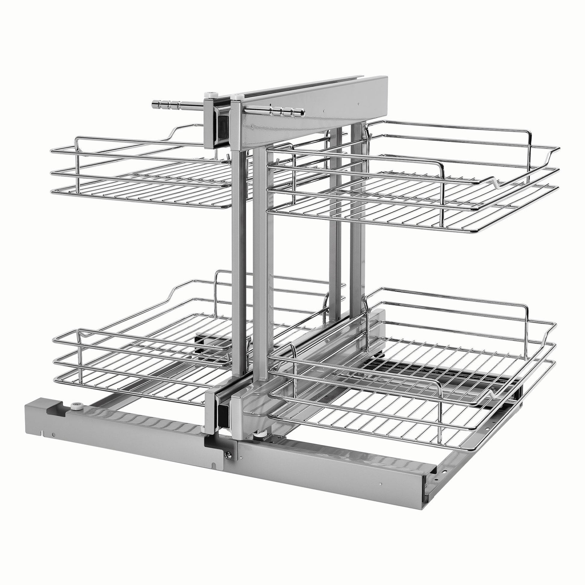 - Steel Two-Tier Pullout Organizer for blind corner cabinets to maximize space and efficiency and provide easier access to everyday kitchen accessories like mixing bowls, pots, and serving bowls