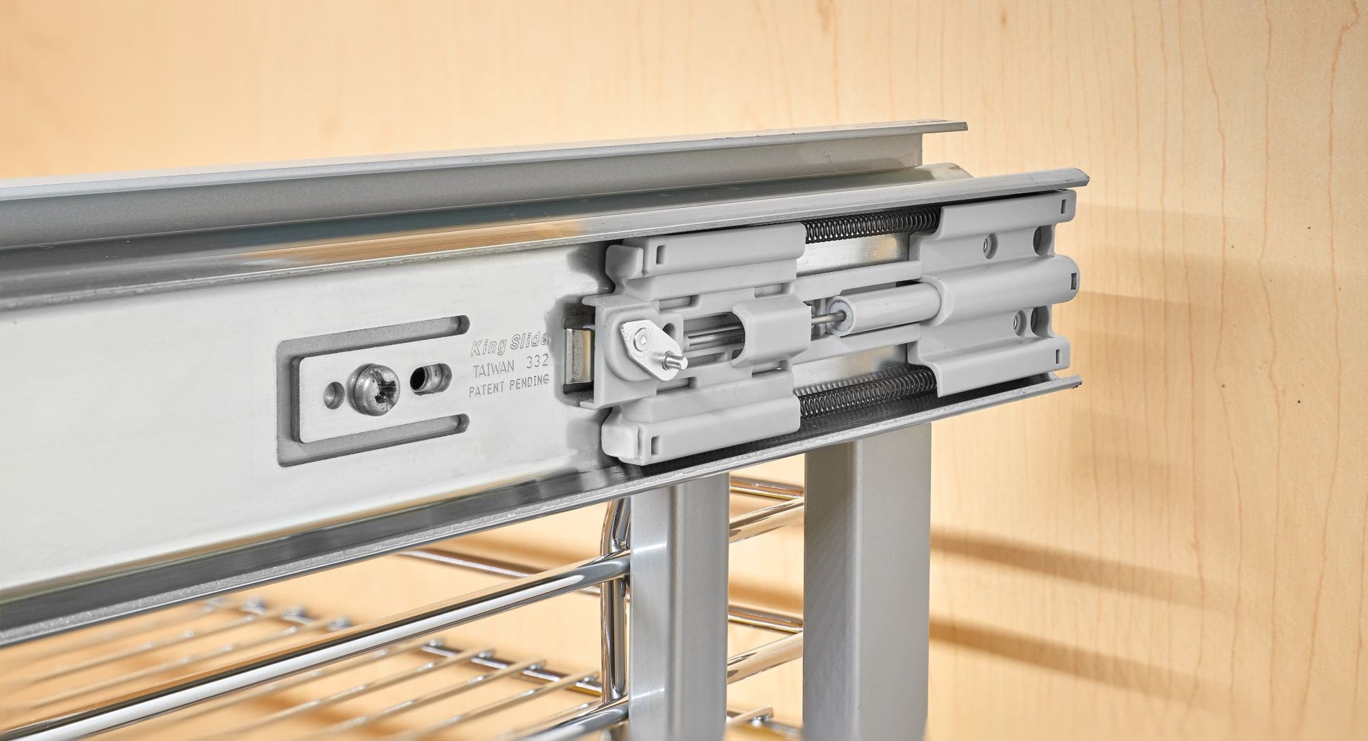 - Simple but effective 3-piece zinc plated full-extension ball-bearing slide system; Unit slides completely outside of cabinet for hard-to-reach items