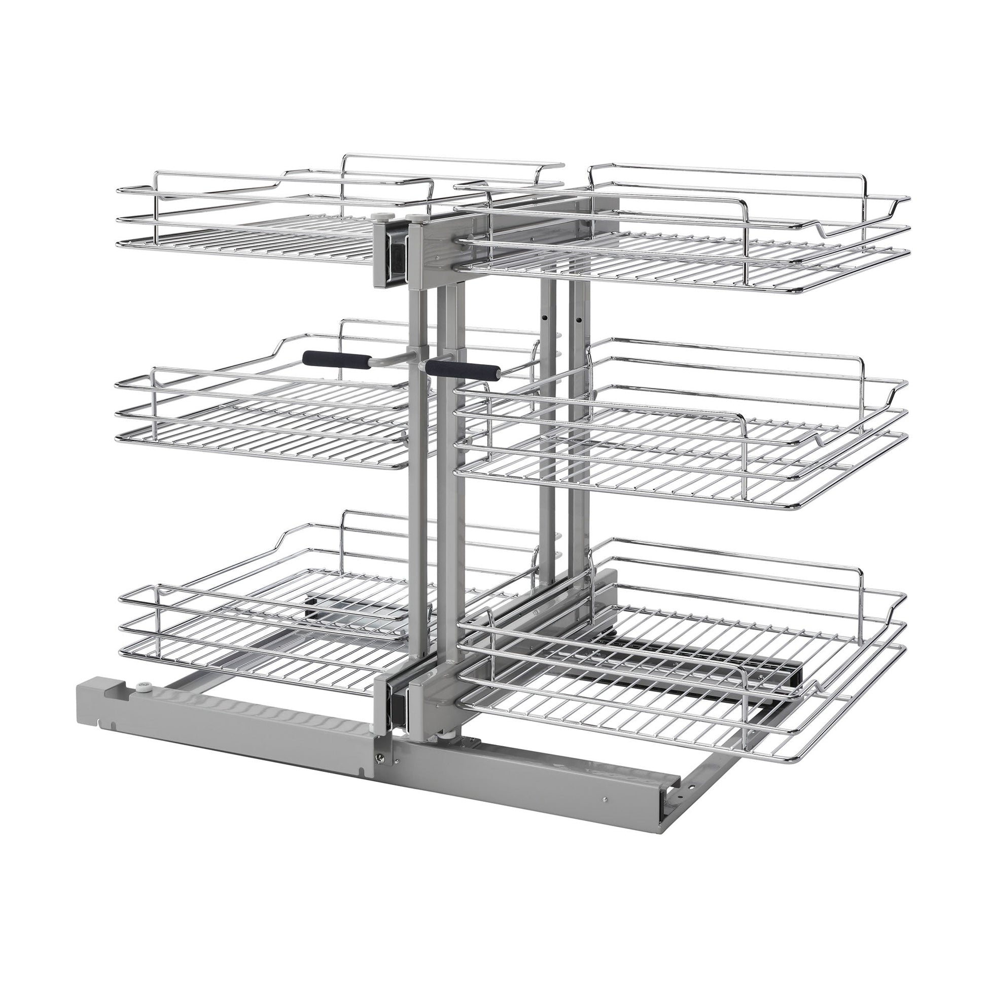 - Steel three-tier pullout organizer with soft-close for blind corner cabinets to maximize space and efficiency and provide easier access to everyday kitchen accessories like mixing bowls, pots, and serving bowls
