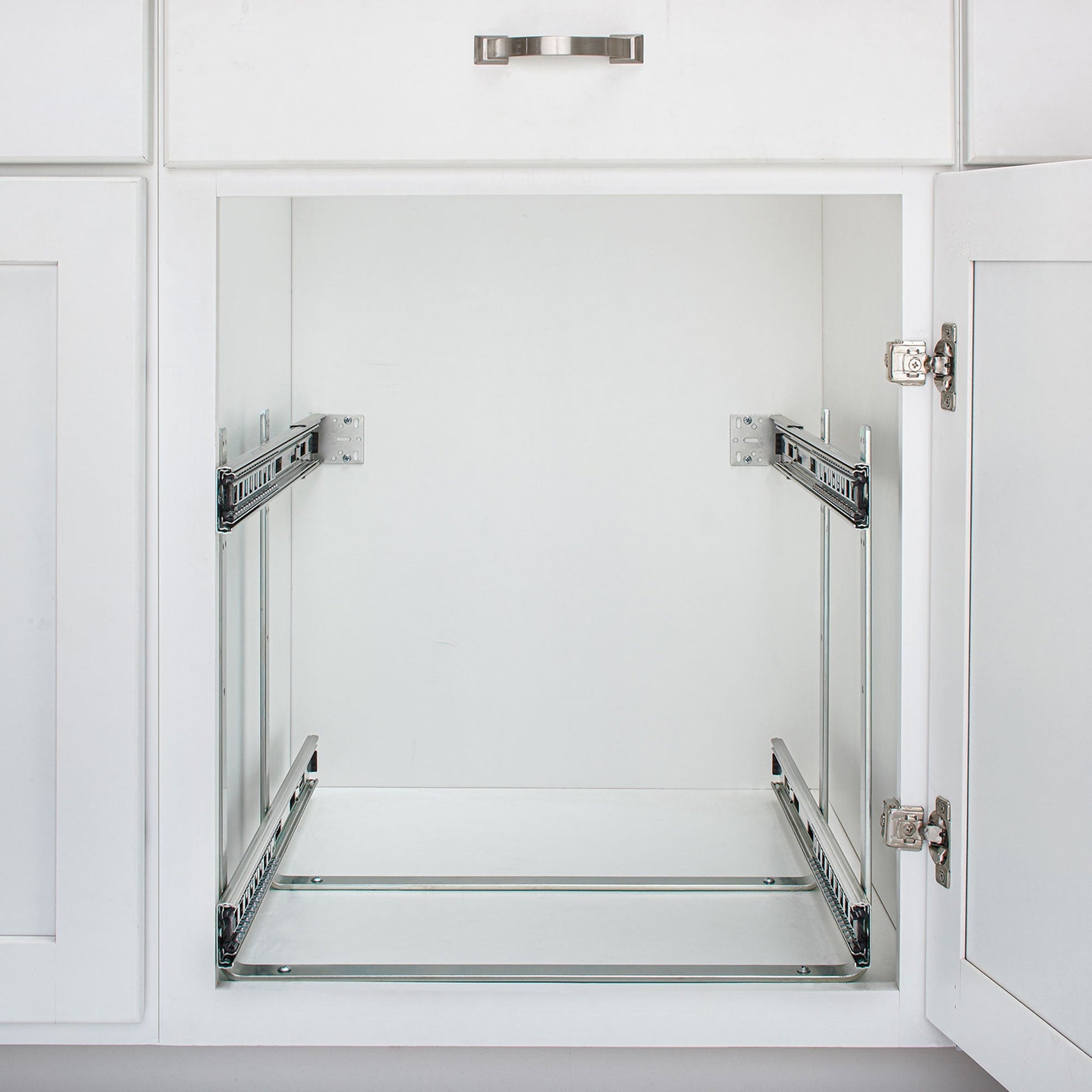 - Bottom Mount Two-Tier Pullout Steel Wire Organizer to access pots, pans, lids, bottles, stand mixers, and other kitchen accessories