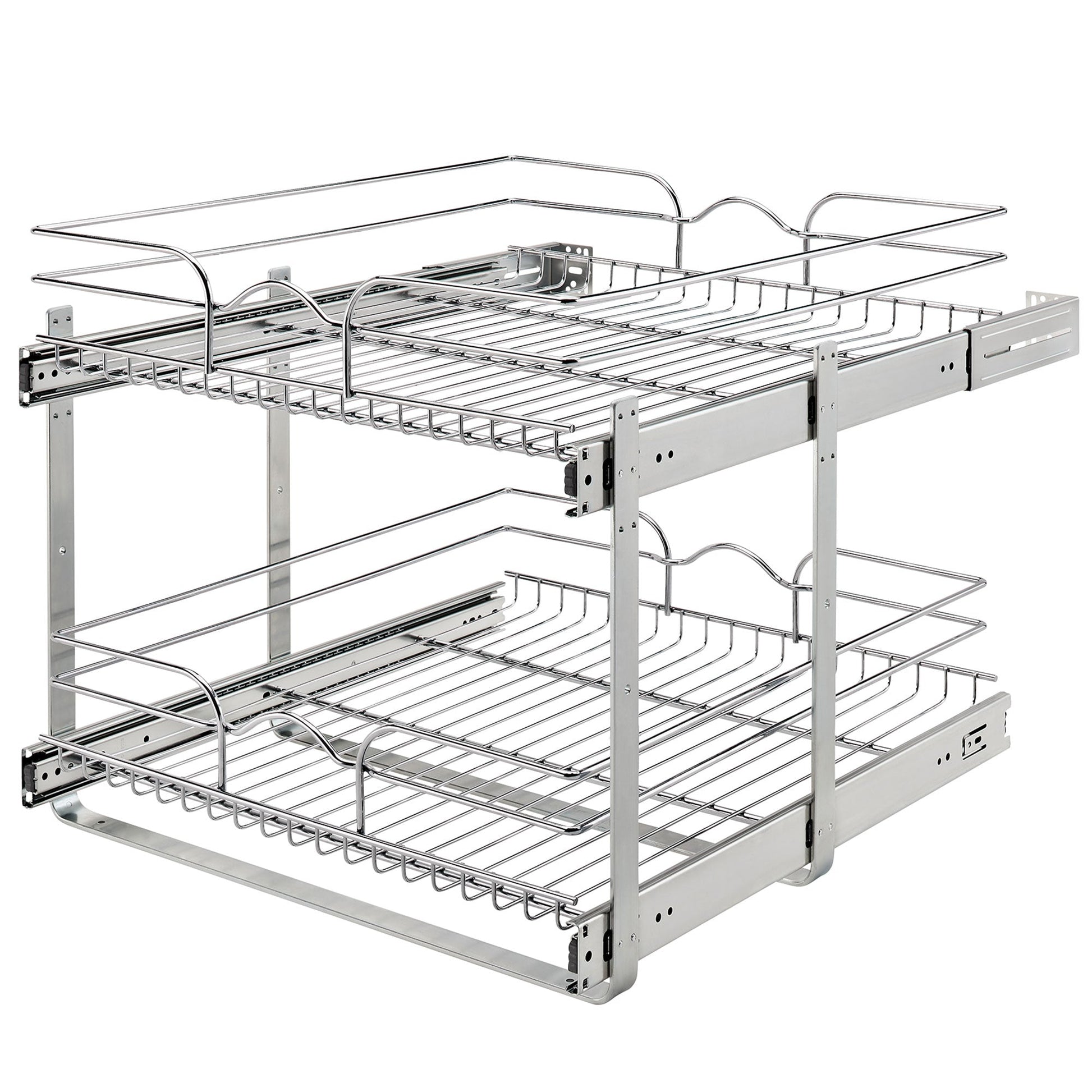 Upgrade and maximize the space in your kitchen cabinets with the redesigned Rev-A-Shelf 2-Tier Wire Pullout Baskets. Multiple sized width and depths are available, so you are sure to find the exact unit that fits your exact cabinet size.