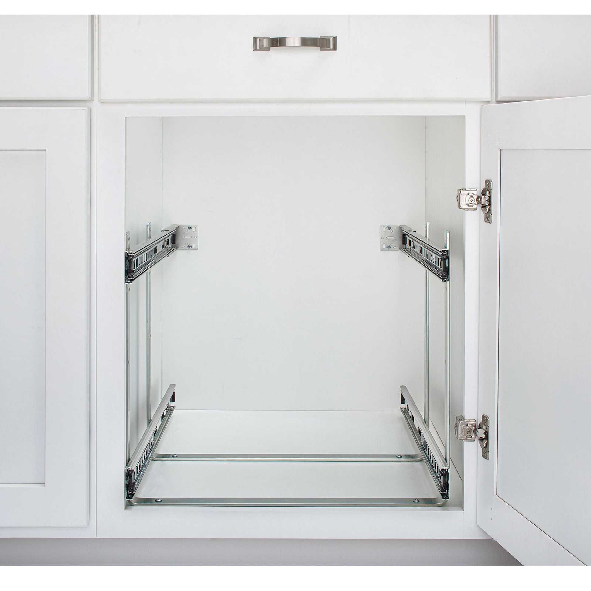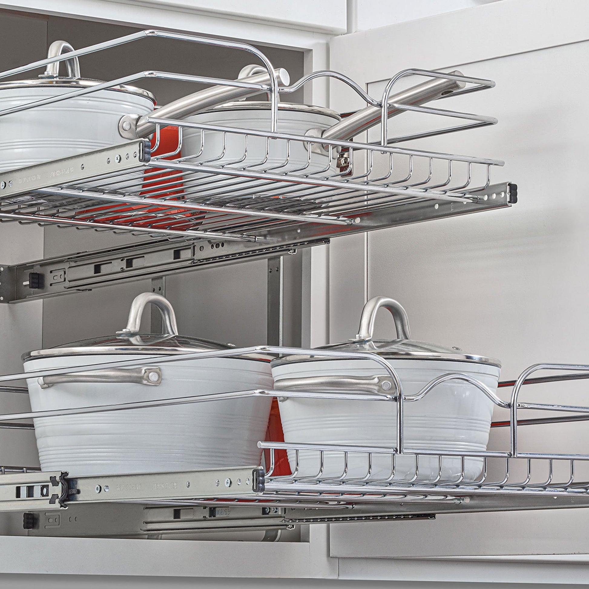 - Bottom Mount Two-Tier Pullout Steel Wire Organizer to access pots, pans, lids, bottles, stand mixers, and other kitchen accessories