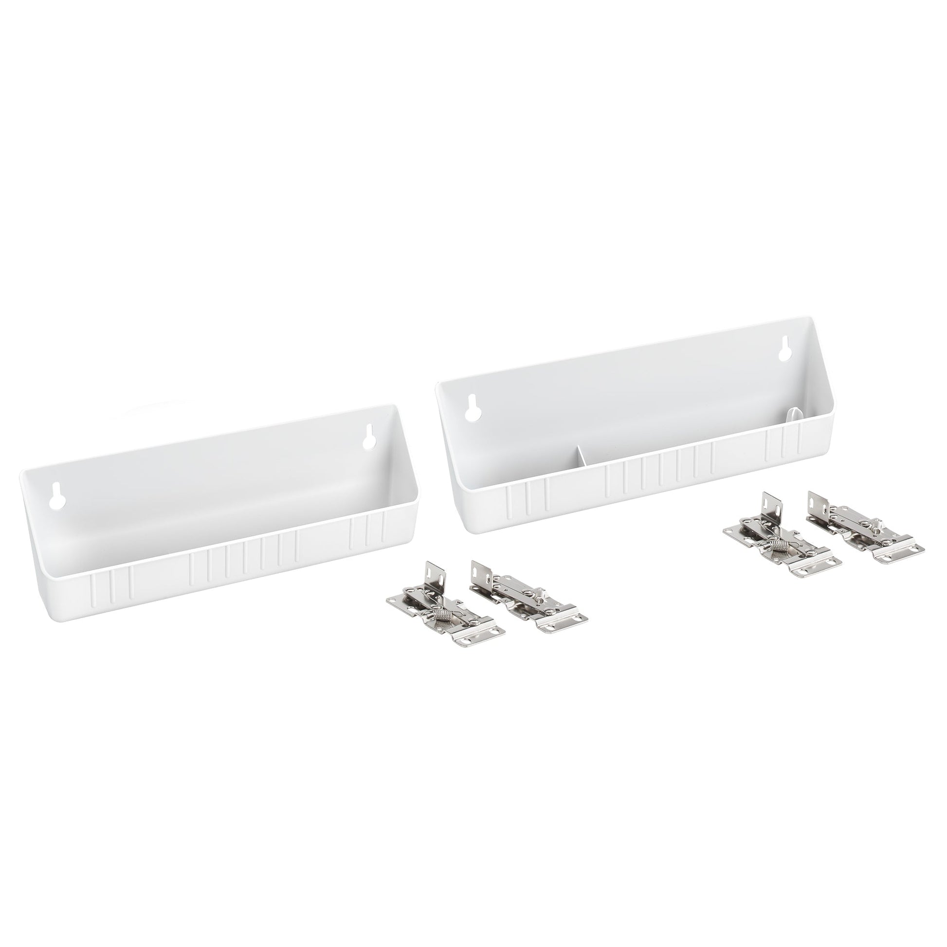- Includes (1) conventional open tray, (1) accessory tray with ring holder and soap dish, and (2) pairs of self-holding hinges