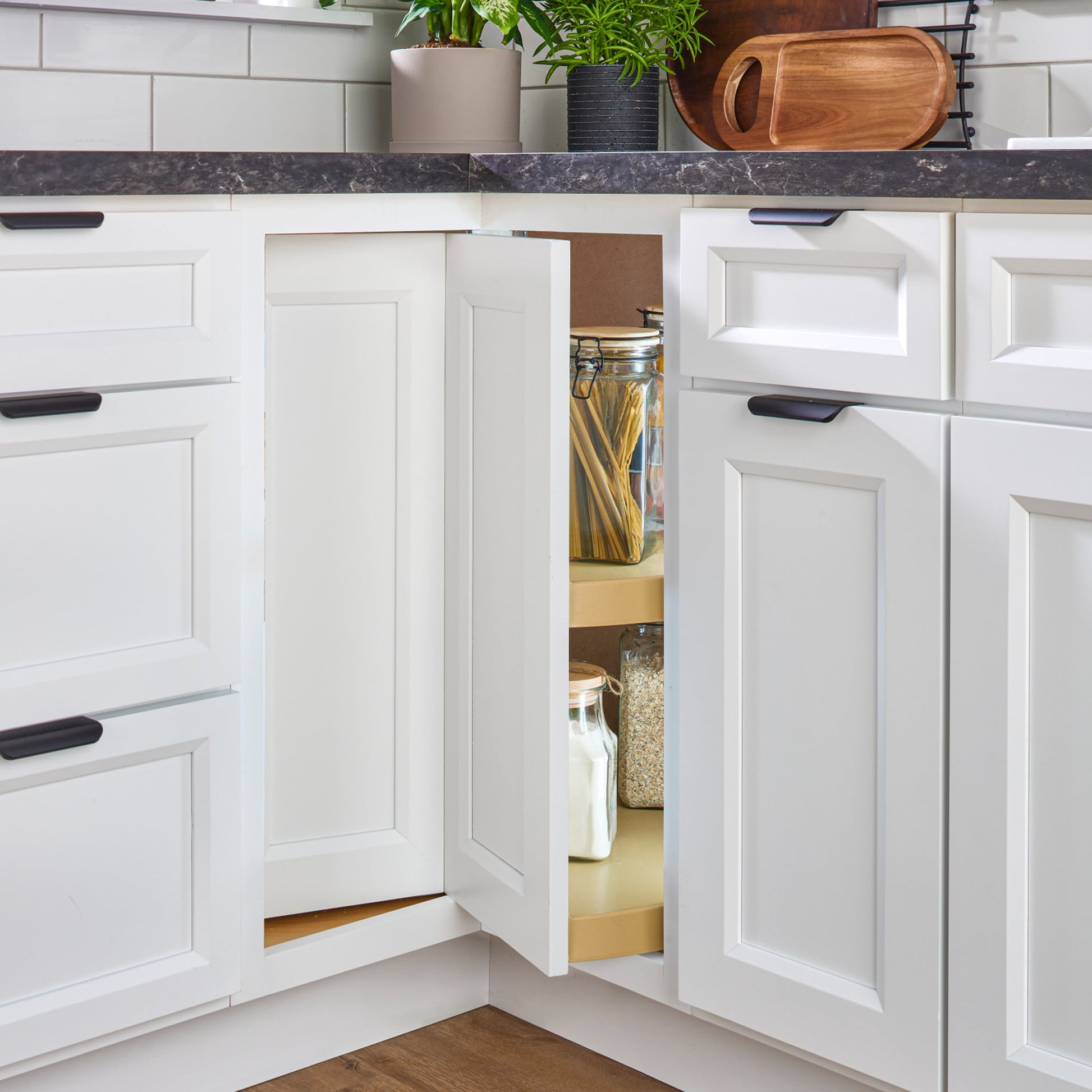 Constructed from injection-molded polymer plastic, this lazy susan is built to last. Please note that most pie-cut lazy susans are installed in new cabinets due to the cabinet door being made specific to the model and cabinet style. All two- and three-tier lazy Susans for wall or base corner cabinets must first be assembled inside the cabinet before final installation. If your door is hinged, you may need kidney-shaped shelves instead of pie-cut shelves. Optimize the space in your corner cabinets today with this 2-Shelf Lazy Susan of Corner Base Cabinets.