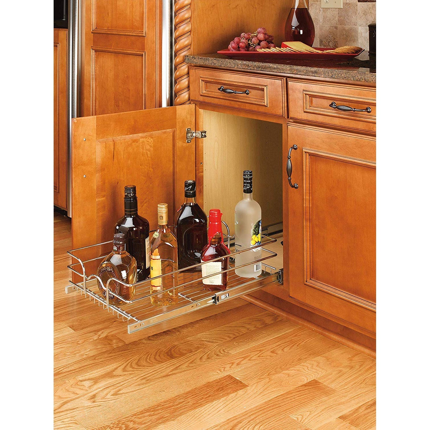 - Single-Tier Bottom Mount Pullout Steel Wire Organizer to access pots, pans, lids, bottles, stand mixers, and other kitchen accessories