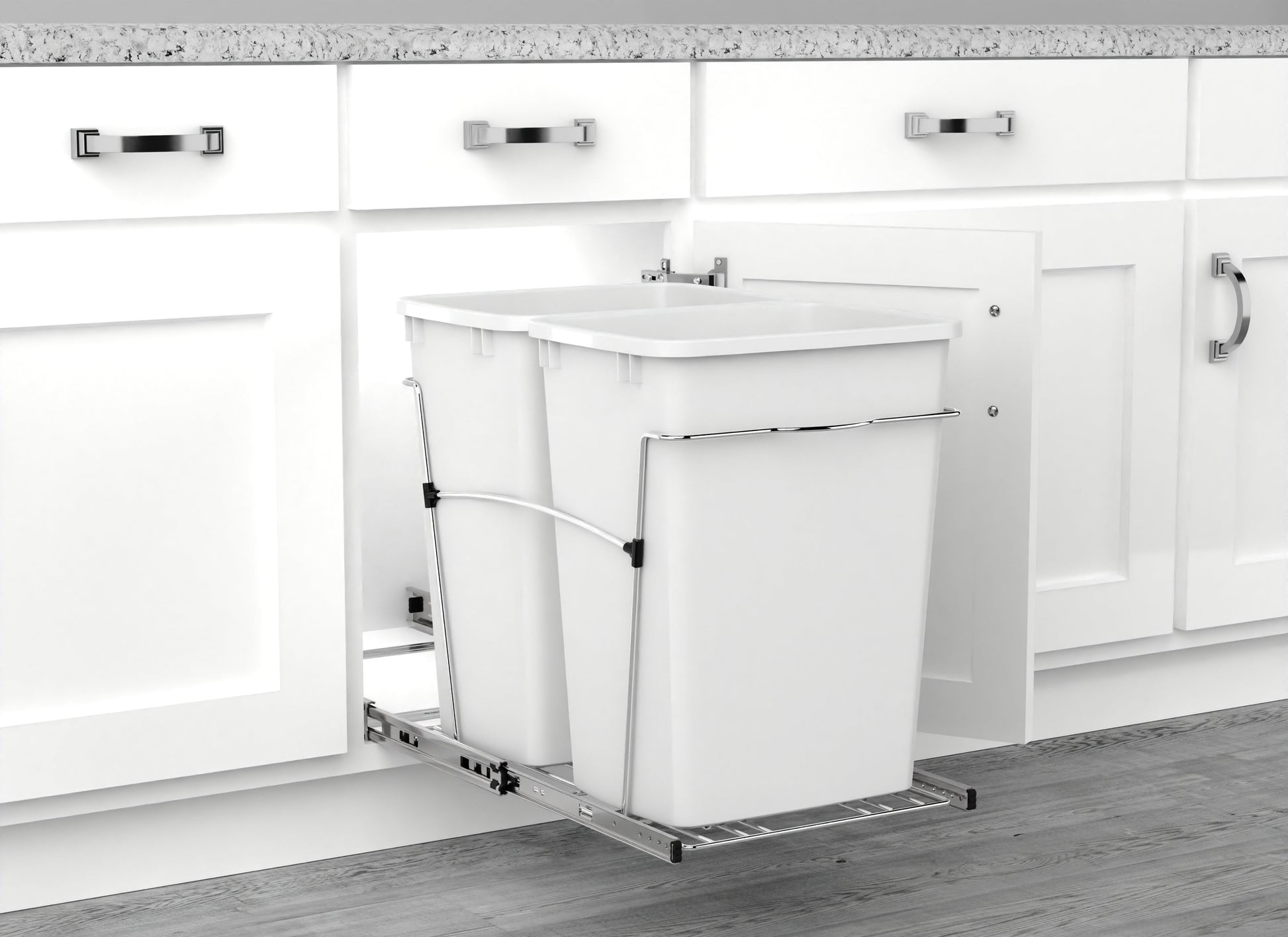 - Keep your kitchen waste and recycling containers hidden but easily accessible with this double 35 qt. pullout system