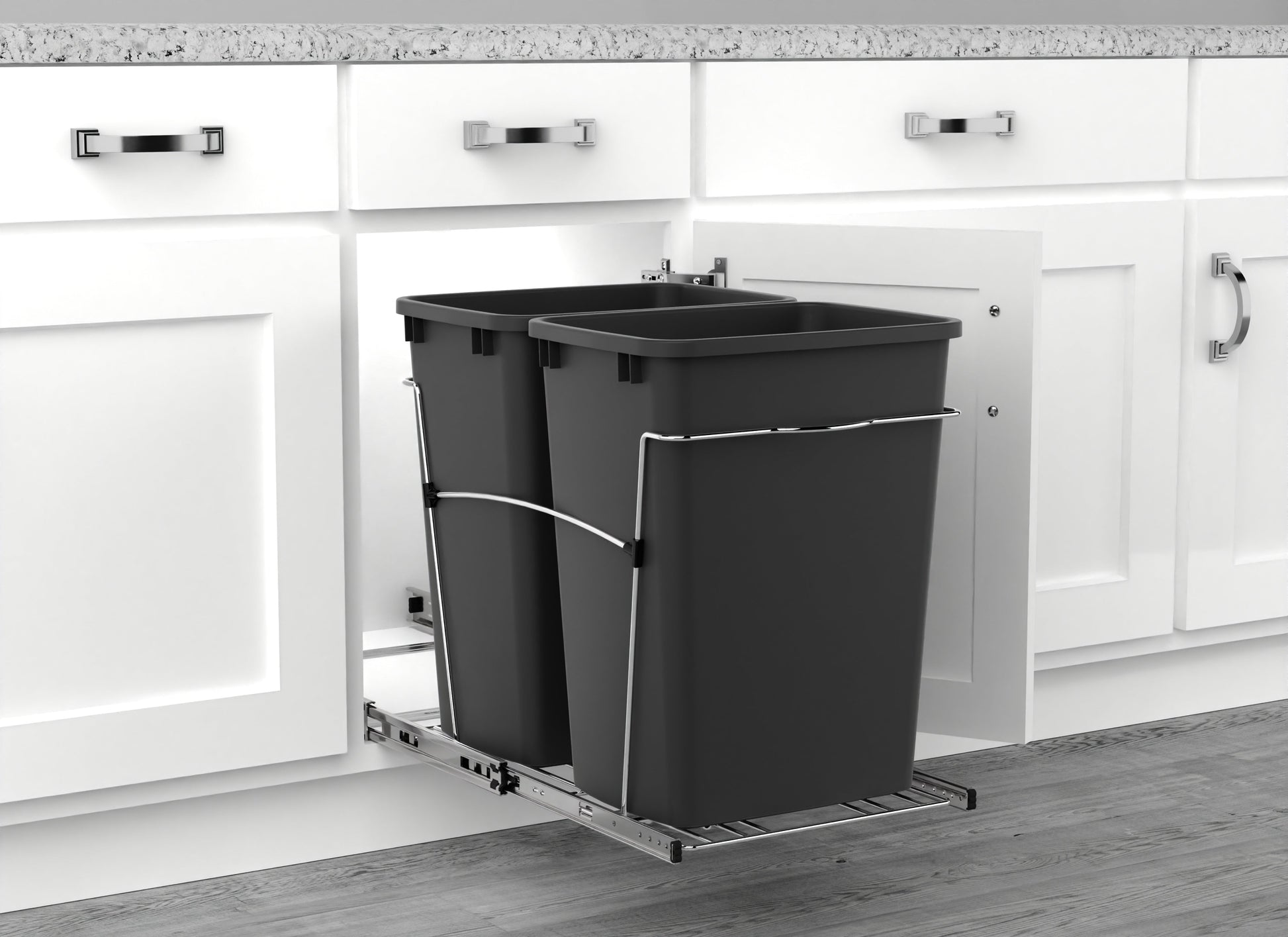 - Keep your kitchen waste and recycling containers hidden but easily accessible with this double 35 qt. pullout system