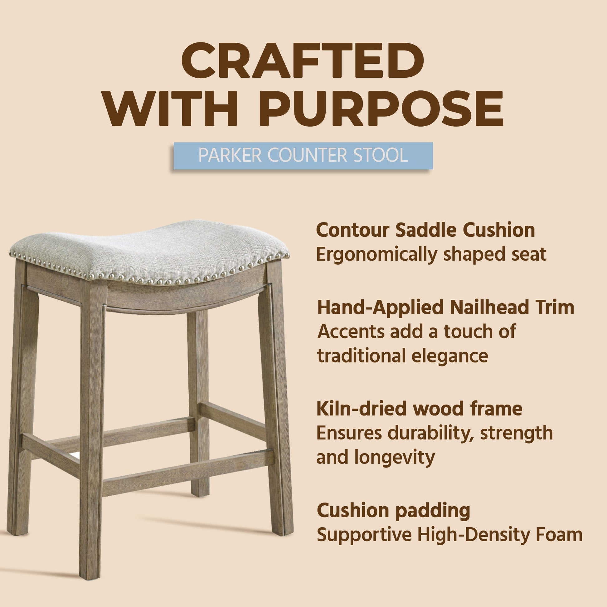 Please measure your space before ordering. We recommend approximately 10" between the bottom of the counter surface and the top of the stool cushion for optimal comfort. Minimal assembly is required for each stool, and the included tools and directions make setup a breeze. Parker counter height stool dimensions and specifications: 19.7"W x 14.2"D x 26"H. We've carefully curated an entire medley of heirloom-quality pieces that can be mixed and matched to create the aesthetic your home has been seeking. Given the handmade nature of our products, expect subtle variations in color, grain, and finish - each one a mark of its authenticity.