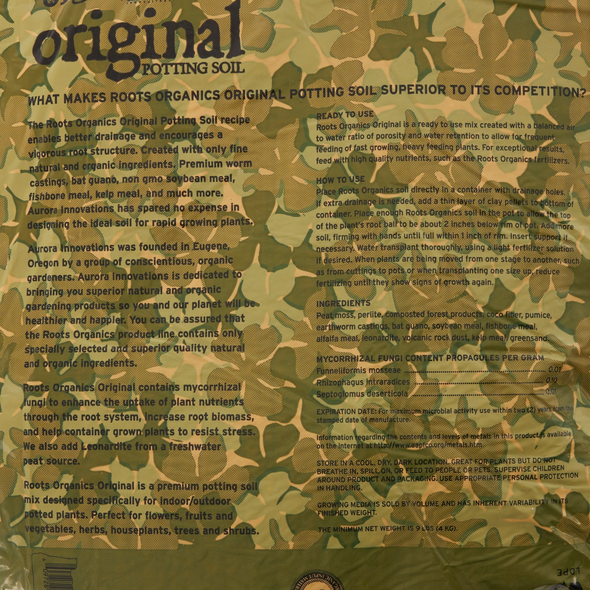 The Roots Organics Potting Soil is already blended with correct proportions of perlite and pumice for excellent drainage and a vigorous root system, Roots Organics potting soil encourages healthier plants and better yields. Comes in a heavy-duty, ready-to-grow, 0.75 cu ft camouflage print bag; simply poke holes in the bottom, cut off the top, and plant.
