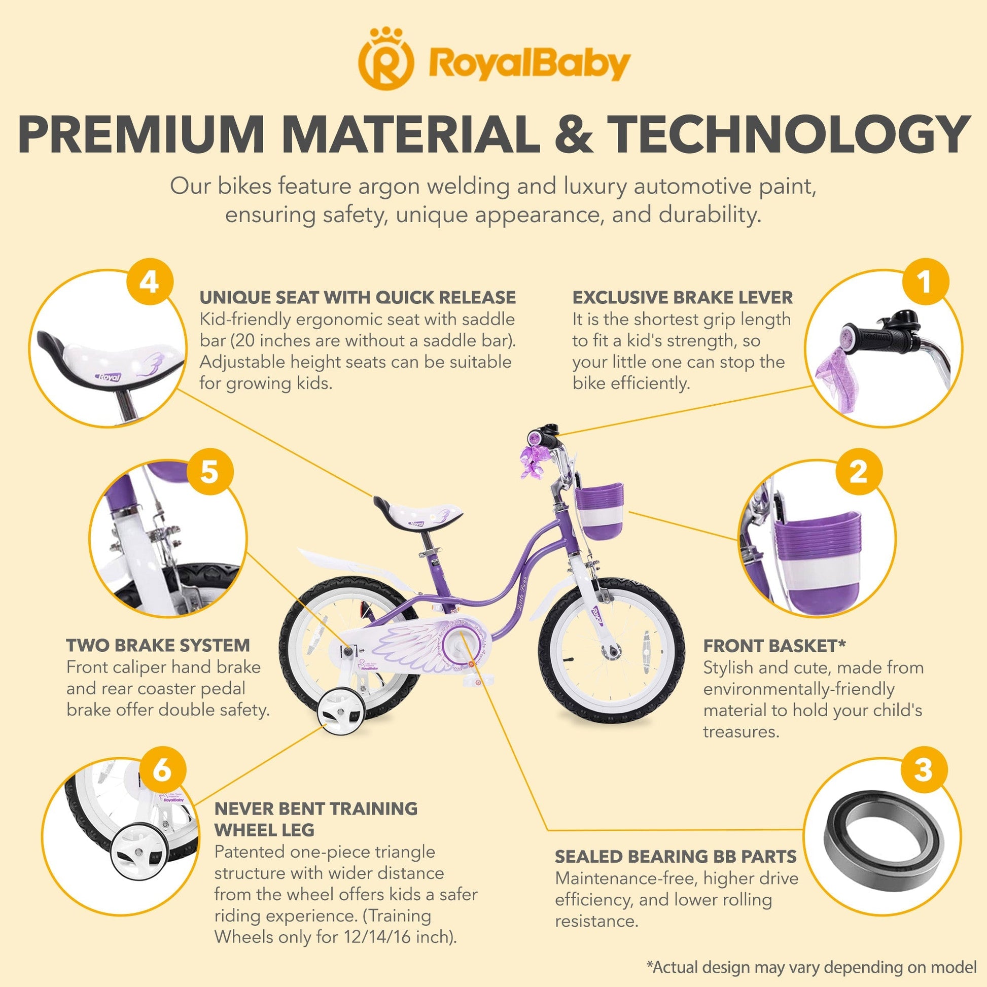 Assembling the bike is a breeze with the included tool kit and easy-to-follow instructions. The durable construction ensures it will withstand the test of time and active play, making it a reliable choice for your child's first bicycle. The RoyalBaby Princess Girl Bicycle is more than just a bike; it's a gateway to adventure, independence, and joy. Watch your child's face light up with excitement and pride as they pedal their way to new adventures.
