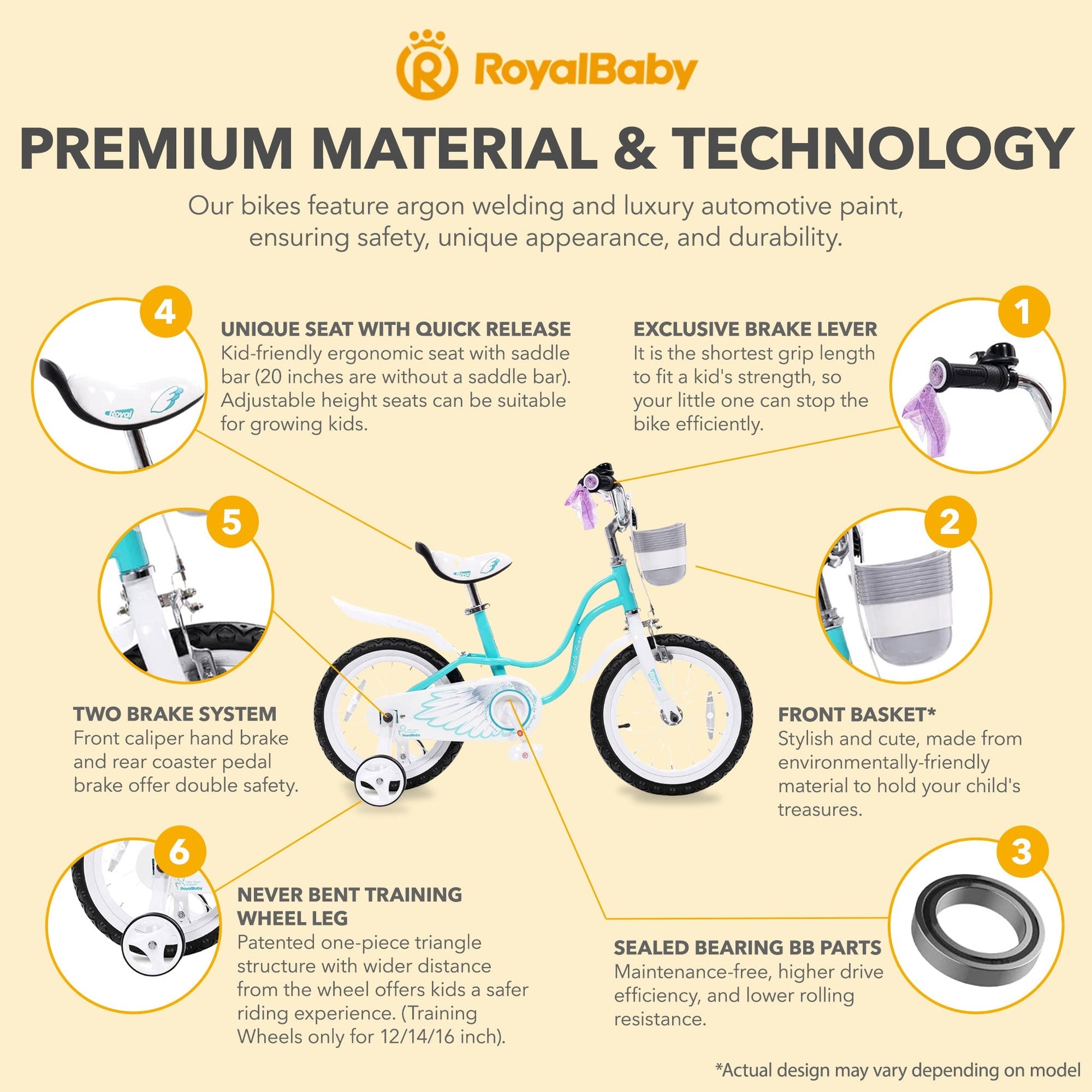 Safety is paramount with the RoyalBaby Princess Bike featuring a robust frame and enclosed chain guard to protect little fingers while the reflectors and bell ensure visibility during riding. Non-slip pedals and durable tires offer excellent grip and control, allowing your child to navigate various terrains with ease. The Princess Bike includes a charming basket, perfect for carrying toys, snacks, or treasures found on adventures to encourage imaginative play.
