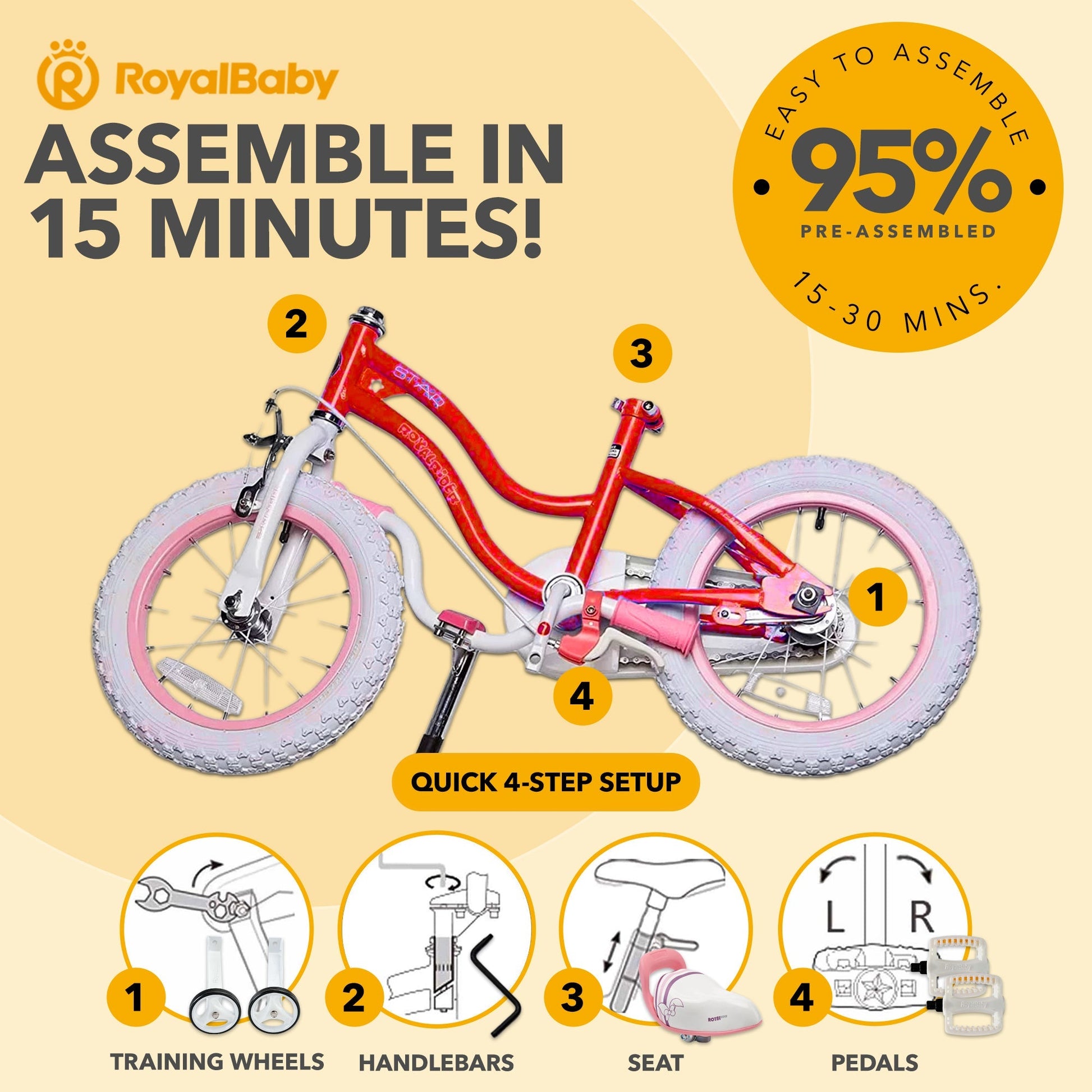 Assembling the bike is a breeze with the included tool kit and easy-to-follow instructions. The durable construction ensures it will withstand the test of time and active play, making it a reliable choice for your child's first bicycle. The RoyalBaby Stargirl Bicycle is more than just a bike; it's a gateway to adventure, independence, and joy. Watch your child's face light up with excitement and pride as they pedal their way to new adventures.