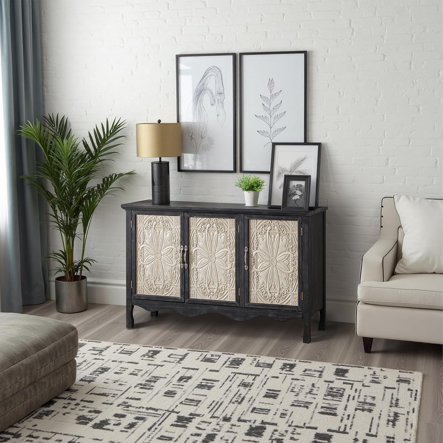 Crafted from a solid wood frame with premium P2-grade MDF, this buffet cabinet delivers lasting durability while staying lightweight and easy to reposition. The antiqued eco-friendly paint enhances the carved wood texture, giving the piece a natural look that complements modern, rustic, or farmhouse interiors. The water-repellent surface allows for easy upkeep, helping you maintain its beauty over time.