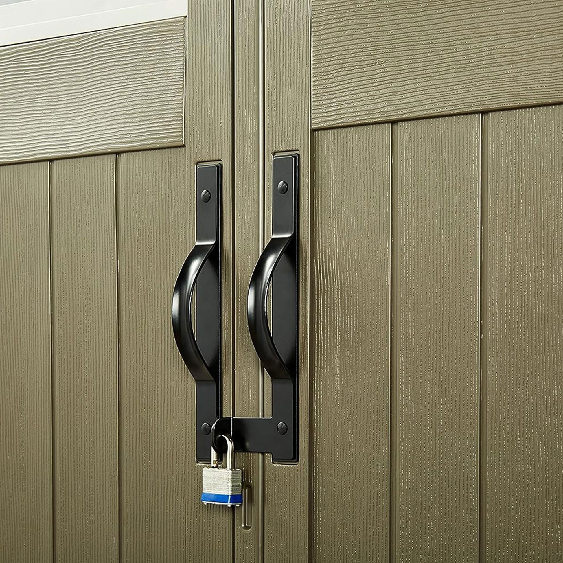 The Rubbermaid shed's design incorporates outdoor lighting, enhancing visibility within the shed. The floor is solid and suitable for heavy storage such as a patio furniture set. Its sand color complements various outdoor decors, whether it's patio tables or other outdoor furniture, creating a cohesive look in your backyard or garden.