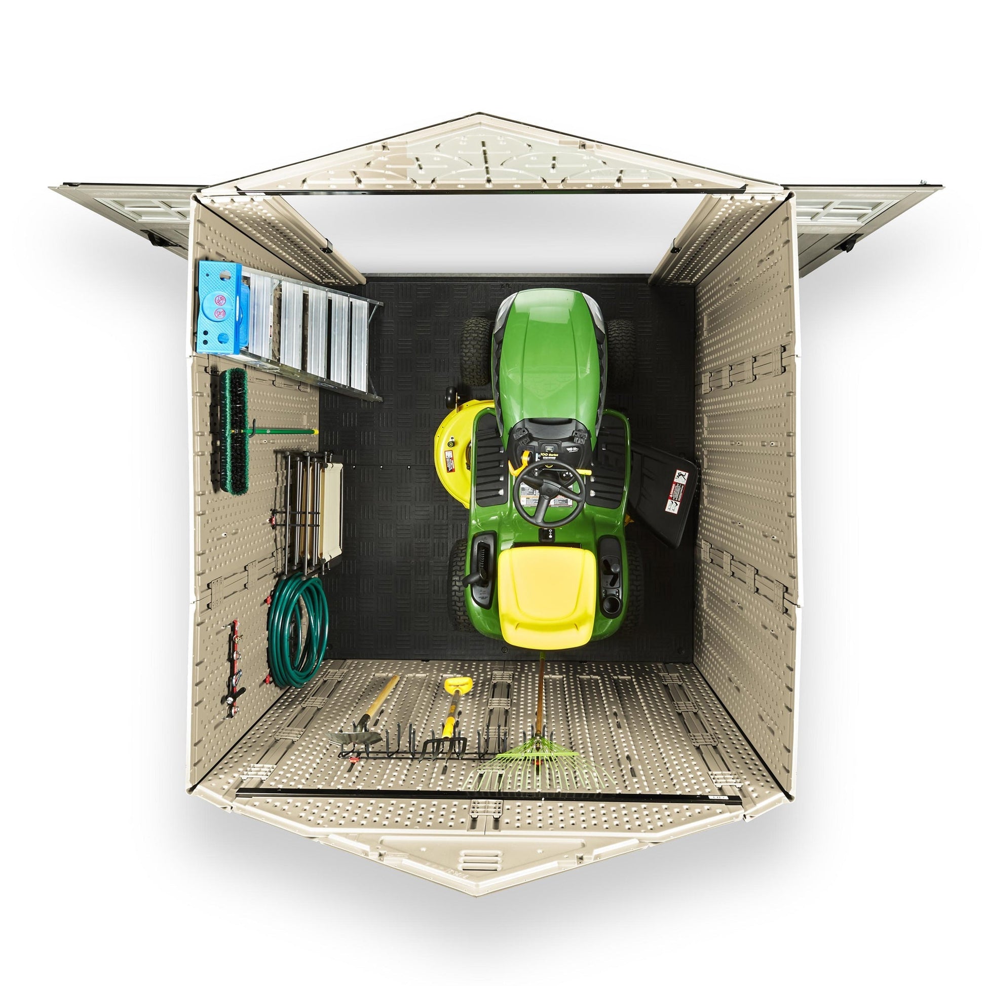 - Large, 332 cubic feet interior provides enough room to fit a riding mower and many other outdoor machines with ease