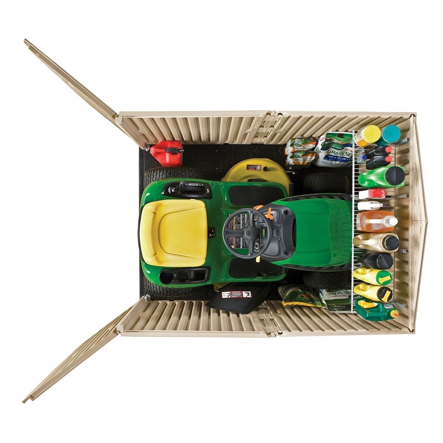 Store bikes, lawn mowers, shovels, garden tools, totes, toys, pool floats, and so much more with this Rubbermaid Slide Lid Outdoor Storage Shed.