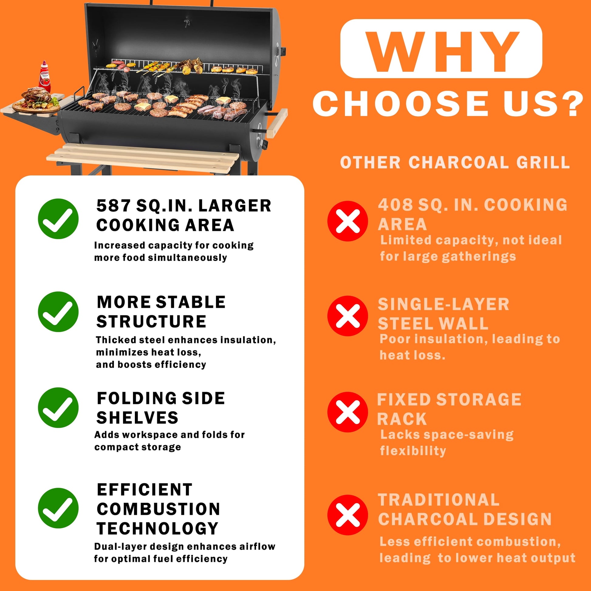 cooking grate provides ample cooking surface for any meal of your charcoal grilling.A perfect BBQ charcoal grill with wooden handles and durable wheels for outdoor camping by getting your friends or family hovering around the charcoal grill,
