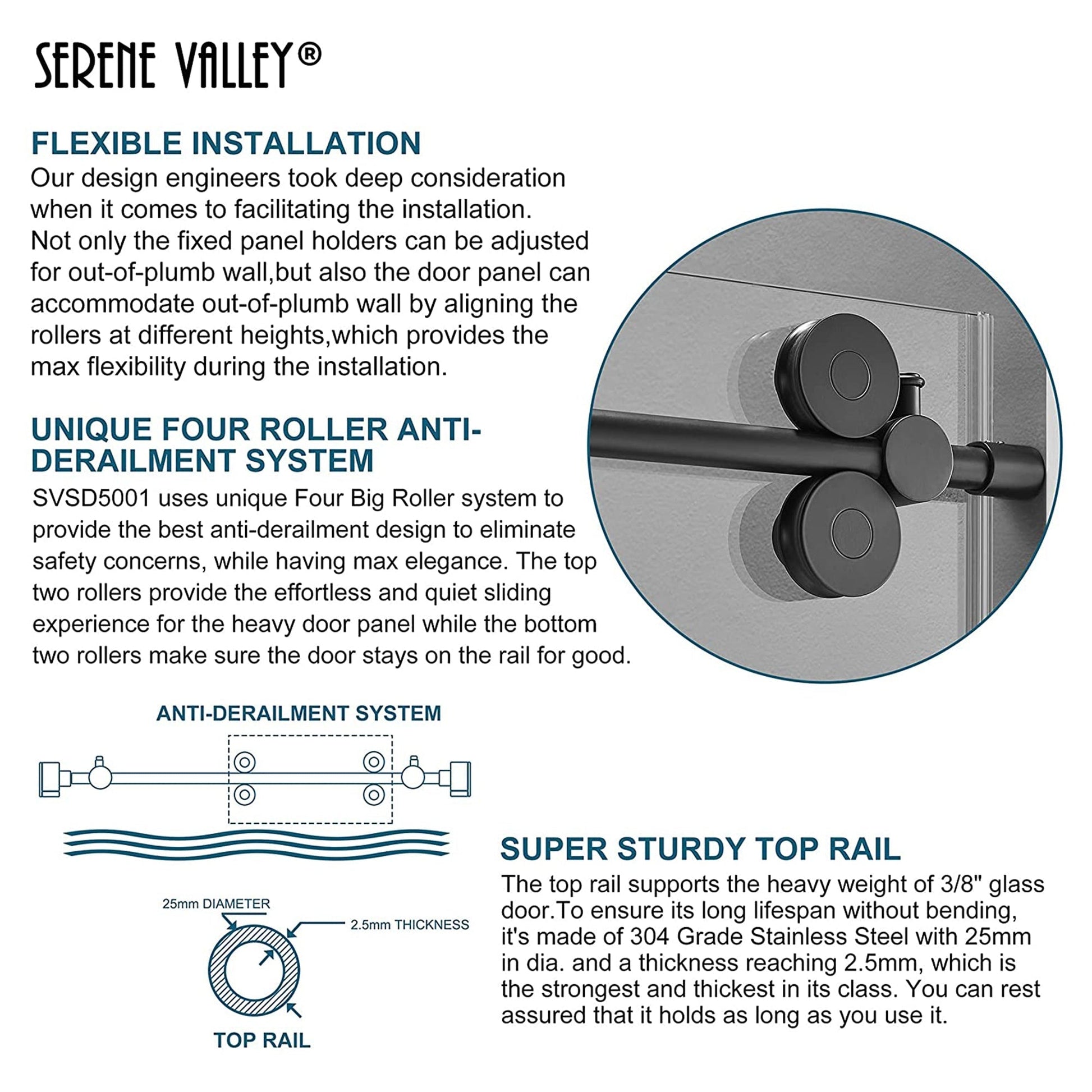 This system comes equipped with 4 heavy-duty stainless steel rollers, each boasting a bulky 3-inch diameter for effortless sliding. These rollers can be mounted on your door panel and accommodate out-of-plumb walls by aligning at different heights, providing maximum flexibility during installation.