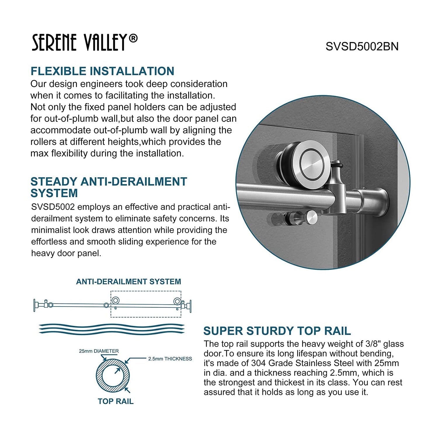 The shower door features an adjustable width from 56 to 60 inches wide and measures 66 inches high. Shower with confidence and ease with the 66 Inch Big Roller Sliding Shower Door from Serene Valley.