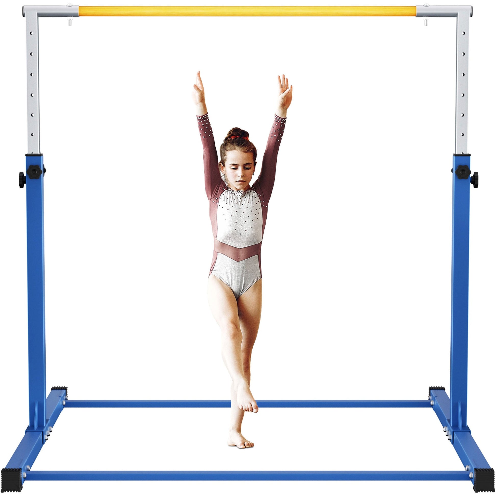 Crafted from premium steel, rubber, and cast iron, this gymnastics workout bar is a testament to durability and strength. Designed with a fixed handle for optimal stability, this gym essential is engineered to support a maximum weight of 300 pounds (135 kilograms), ensuring safety and confidence during every practice session. Built with a triangular structure and enhanced with four anti-slip rubber floor rings on the base support tube, along with 2 round pedestals, this weight set offers unparalleled stability. Your child can train with peace of mind, knowing they're supported by a reliable and secure platform. What truly sets this gymnastics equipment apart is its adaptability. Adjustable with a simple spin-lock knob, this gym equipment for home grows alongside your child, accommodating their evolving skill levels and heights from 3 to 20 years old. Whether they're mastering basic techniques or honing advanced maneuvers, this professional-grade bar provides the perfect foundation for their gymnastics journey.