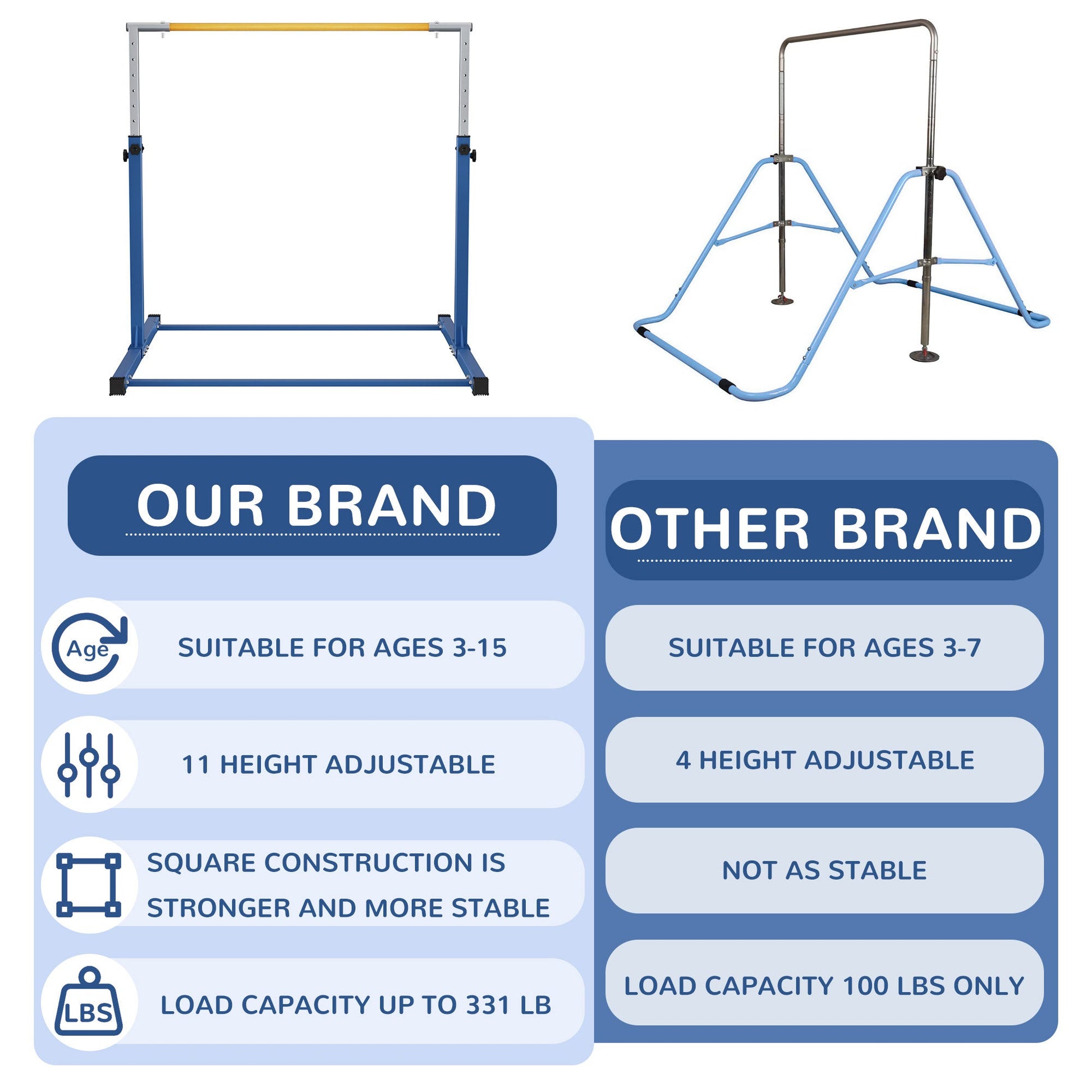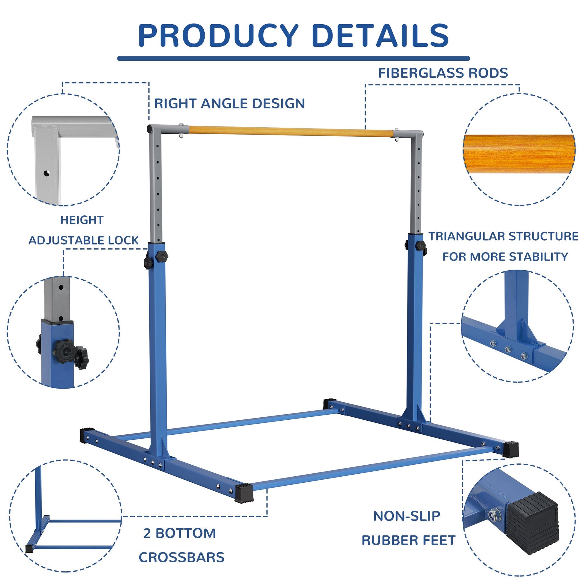 - Stability and safety of this gymnastics bar are guaranteed by its triangular structure, reinforced with anti-slip rubber floor rings, providing a secure foundation for training sessions