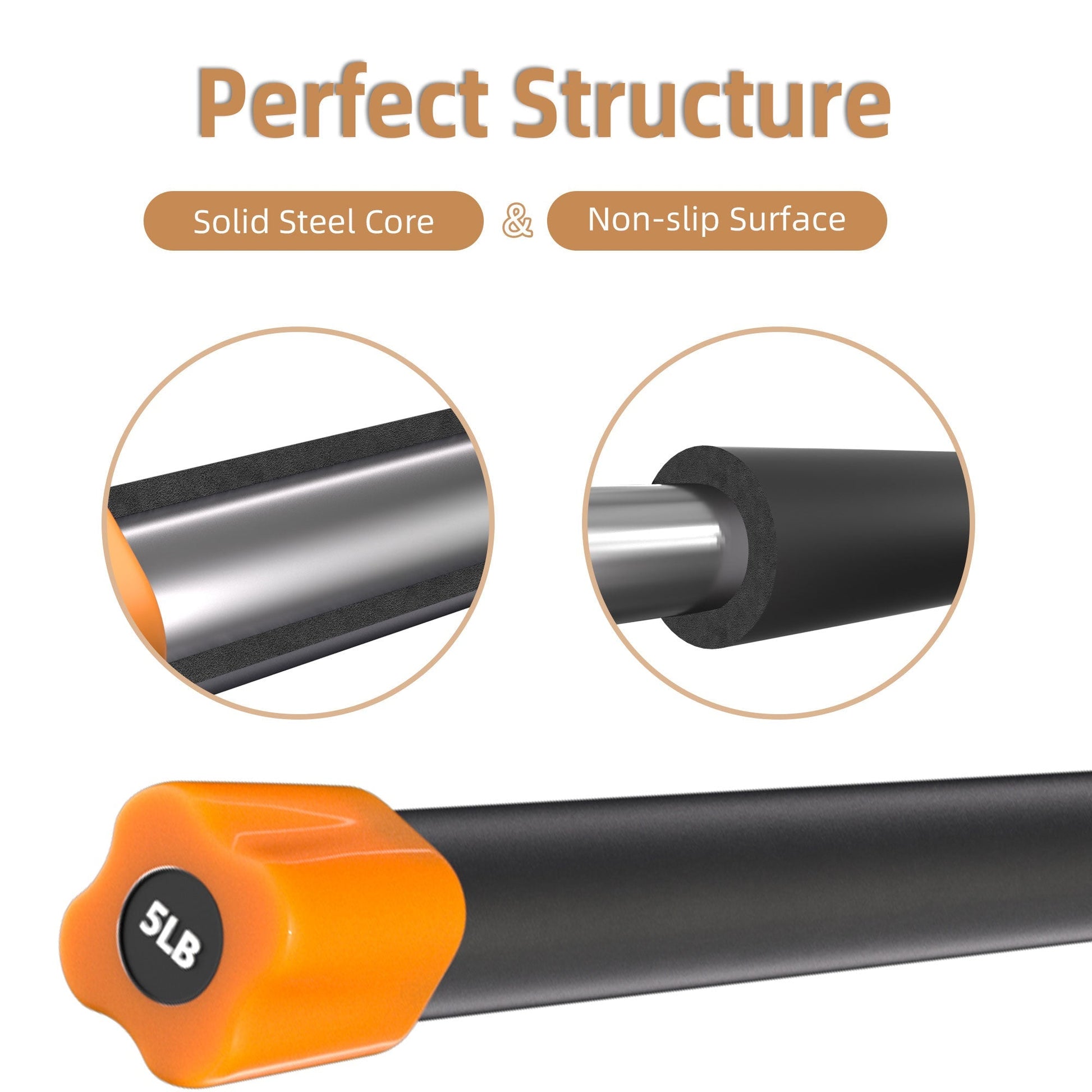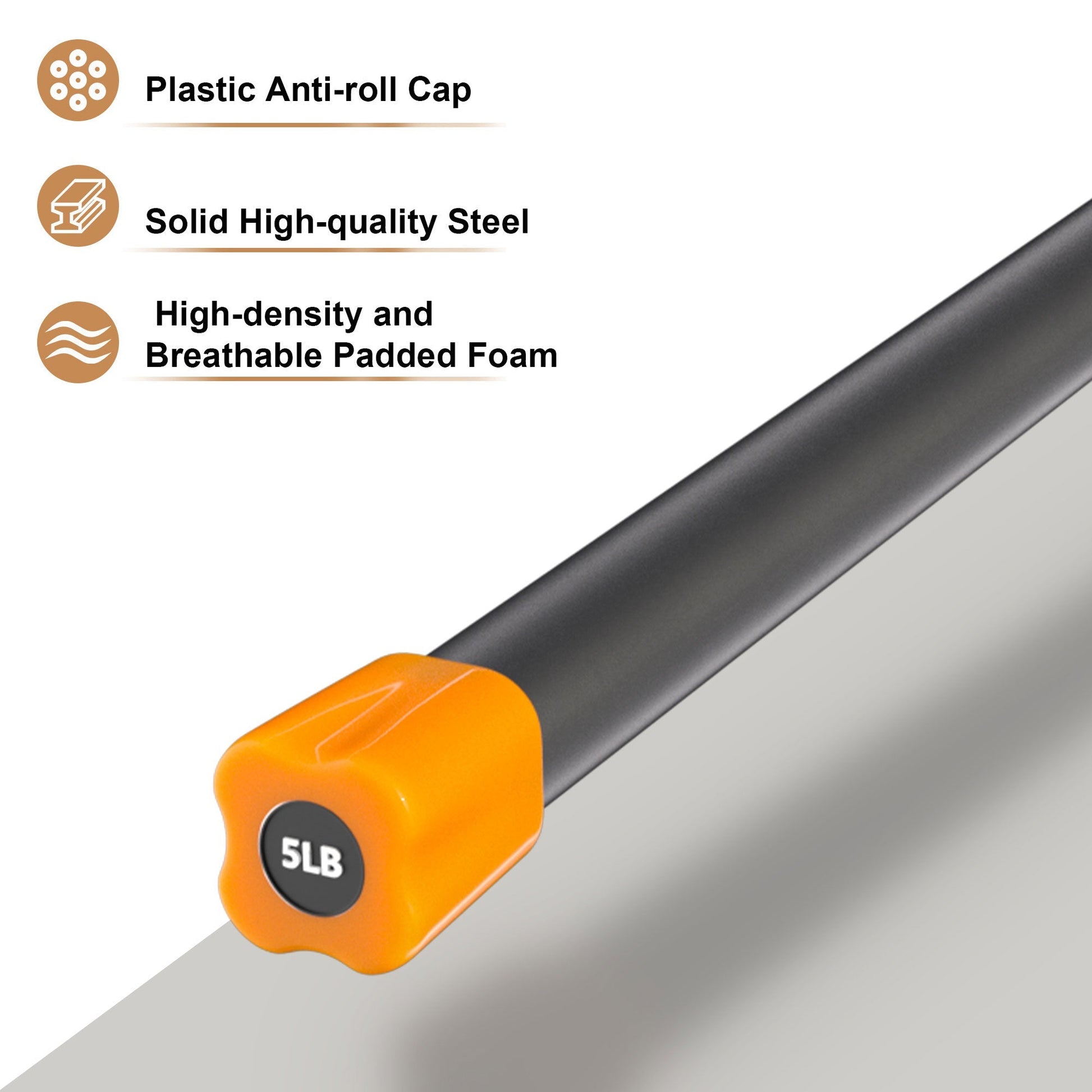 These bars are crafted from solid, top-tier steel and guarantee unmatched toughness, durability, and stability. Their sturdy construction ensures they will not bend or break, even with the most rigorous use. The bars feature a high-density, breathable, padded foam surface, offering maximum comfort and grip. Say goodbye to slipping, even during the sweatiest sessions. The ergonomic design of the foam surface enhances your workout experience by providing a secure and comfortable hold, allowing you to focus on your exercises without distraction. Quickly identify the weight of each bar with the convenient color-coded caps. These caps help with quick selection and are specially designed to prevent rolling, making storage trouble-free and safe. This set comes with 3 weighted bars weighing 5, 8, and 12 pounds. The bars are 48 inches long and come in various diameters, ranging from 1.2 to 1.8 inches, catering to different weights and fitness levels. The Signature Fitness Weighted Bars are versatile enough to meet all your fitness needs, whether you're engaging in strength training, balance exercises, or aerobic workouts. Their solid steel core and padded foam surface make it ideal for beginners and seasoned fitness enthusiasts.