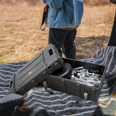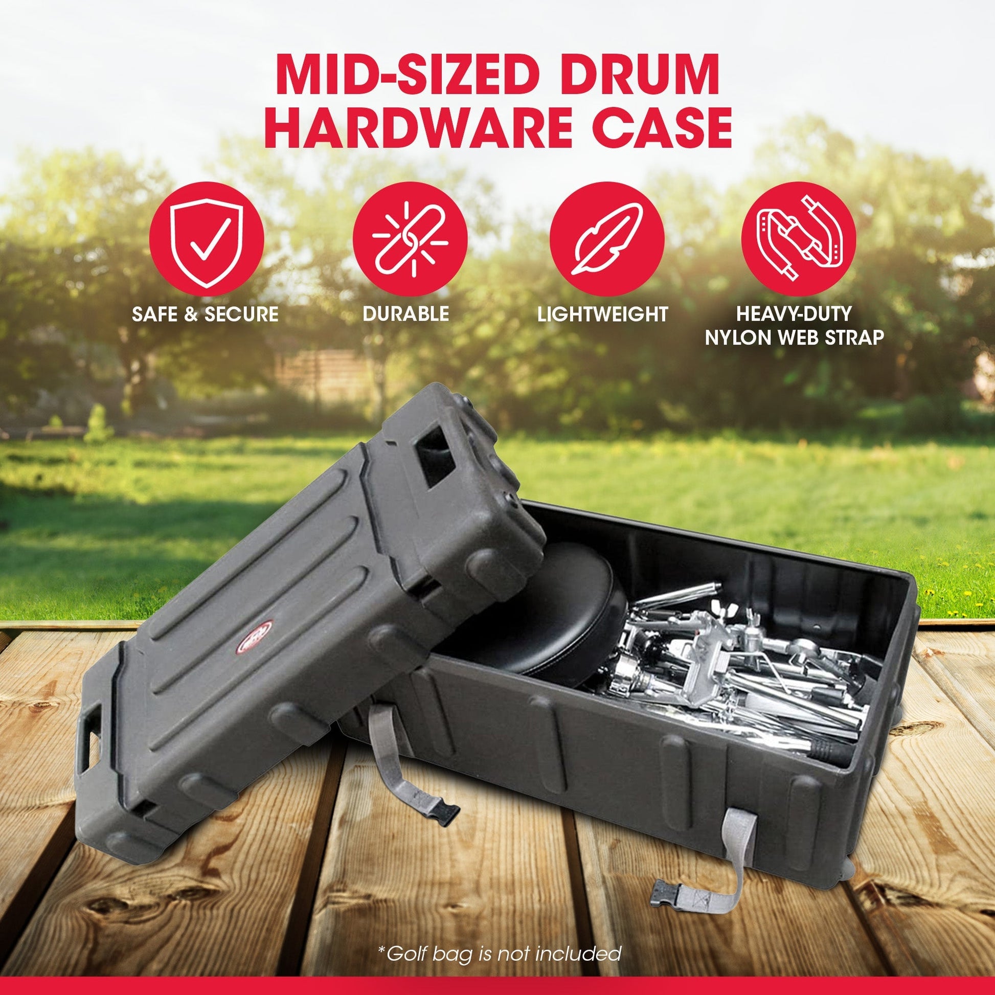 Proper storage and organization is essential for drummers traveling from gig to gig. The SKB Mid-Sized Drum Hardware Case ensures all your items are safe and secure as you head to your next concert or jam session. Compact and perfect for transport, the hardware case works great for easy transportation. The spacious interior holds everything from screws and tools to seats and stands. Tote the case anywhere with the convenient pull-out handle, and roll your kit to your next gig on the built-in roller blade wheels. The small size allows the case to comfortably fit in your trunk or backseat, perfect for the on-the-go drummer concerned about space. Once you arrive, you can set up easily with the telescoping lift-off cover. After you pack up, secure the case with the heavy-duty nylon web strap and high-tension slide release buckles. Durable, polyethylene plastic and injection-molded handles ensure the case and its contents survive the trip so you're ready to rock out on arrival. Perfect for amateurs and pros alike, keep your kit safe on your next trip with the SKB Mid-Sized Drum Hardware Case.
