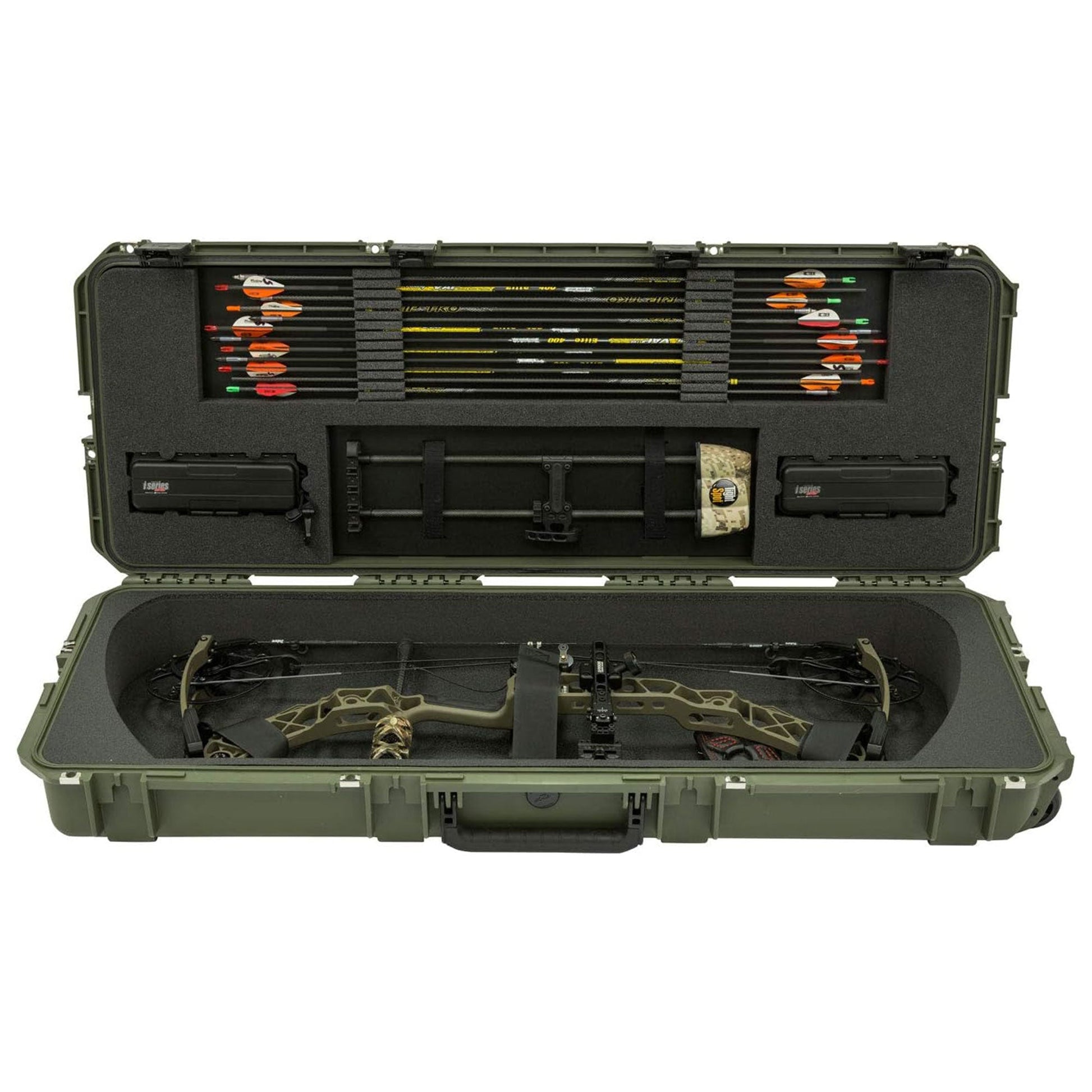 This hard case has 4 patented trigger latches, 4 reinforced padlock locations, cushioned snap-down handles on 3 sides, and in-line skate-style wheels for transporting your gear worry-free. The interior of the bow case features a custom foam insert for secure positioning and cushioning of your gear with a water-jet cut foam arrow system that holds up to 12 arrows.