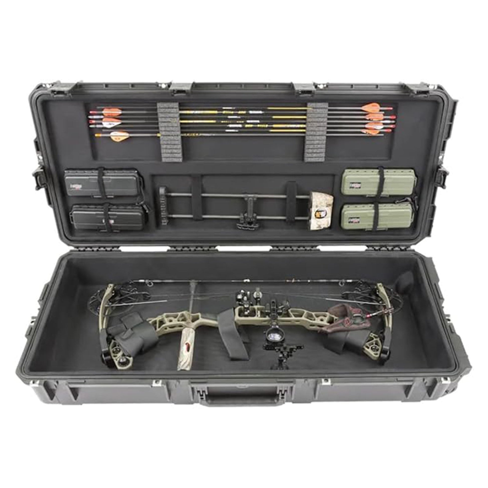 The interior fits bows up to 41.25 inches long and 16 inches wide. A waterjet cut foam system below the bow holds up to 12 arrows, while the lid provides storage for a quiver and SKB iSeries 0702-1 accessory boxes (sold separately). The layout is ideal for keeping your archery tools close and organized on the go.