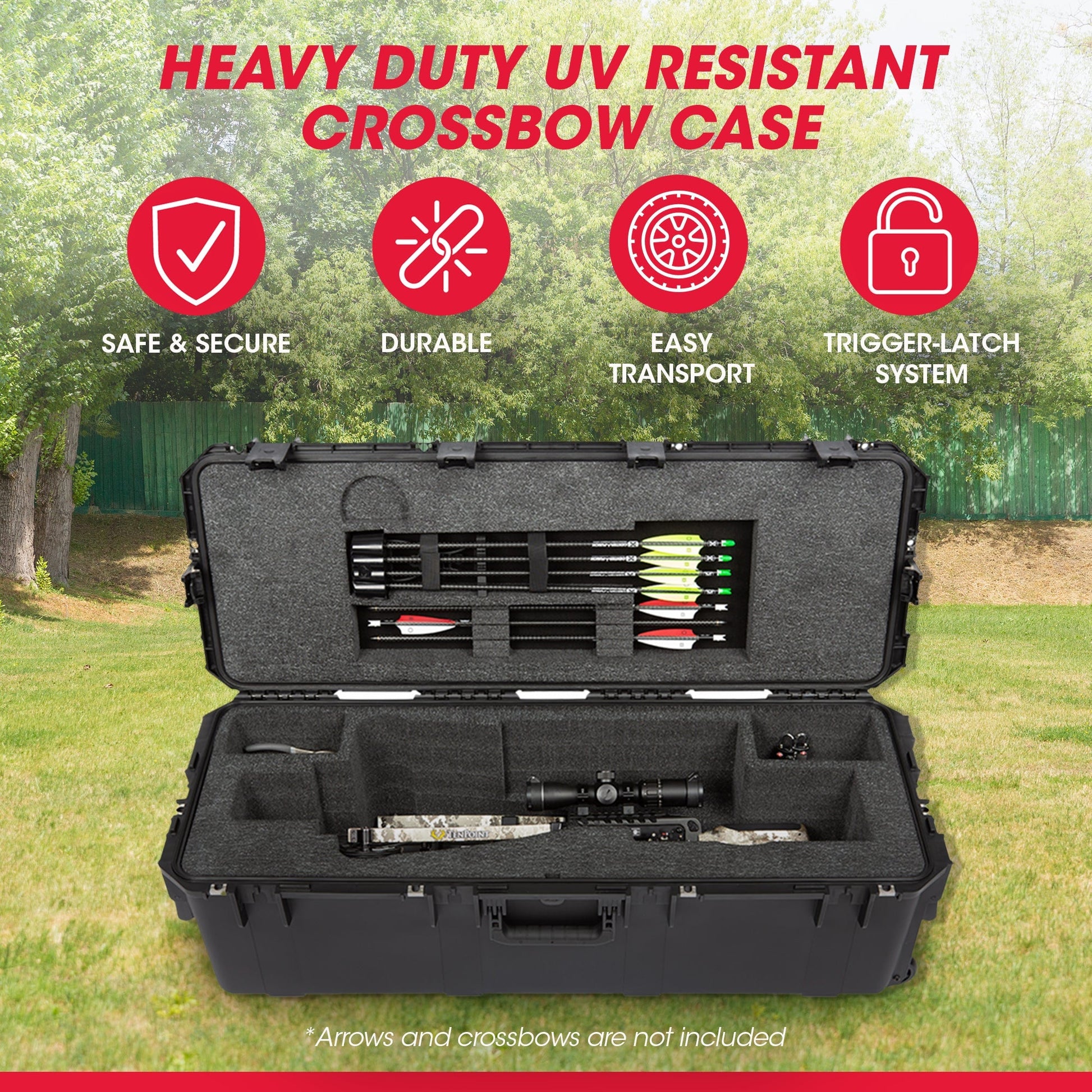 - Hard-shell crossbow case constructed of high-strength polypropylene resin with a gasket, water, and dust-tight design