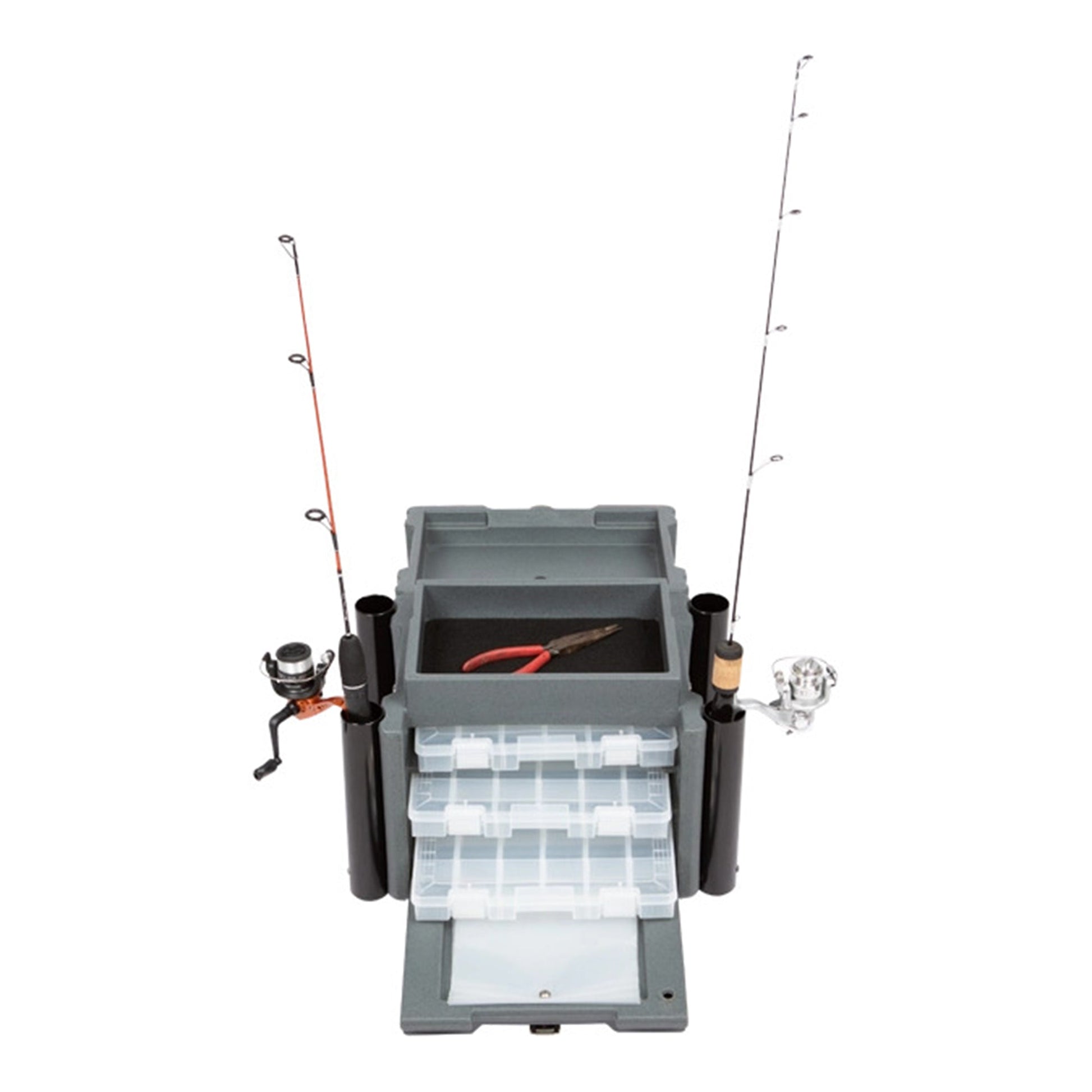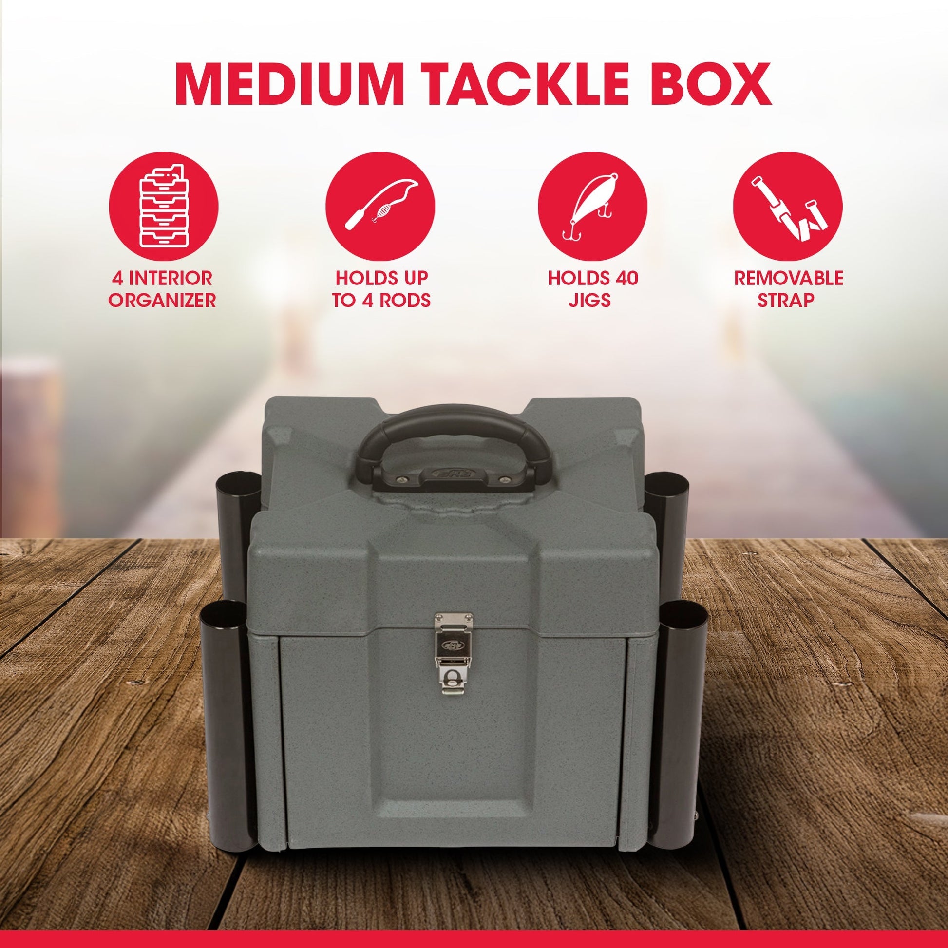 - Medium Tackle Box includes 4 interior organizer boxes with adjustable dividers and a clear acrylic lid compartment for quick-access items.