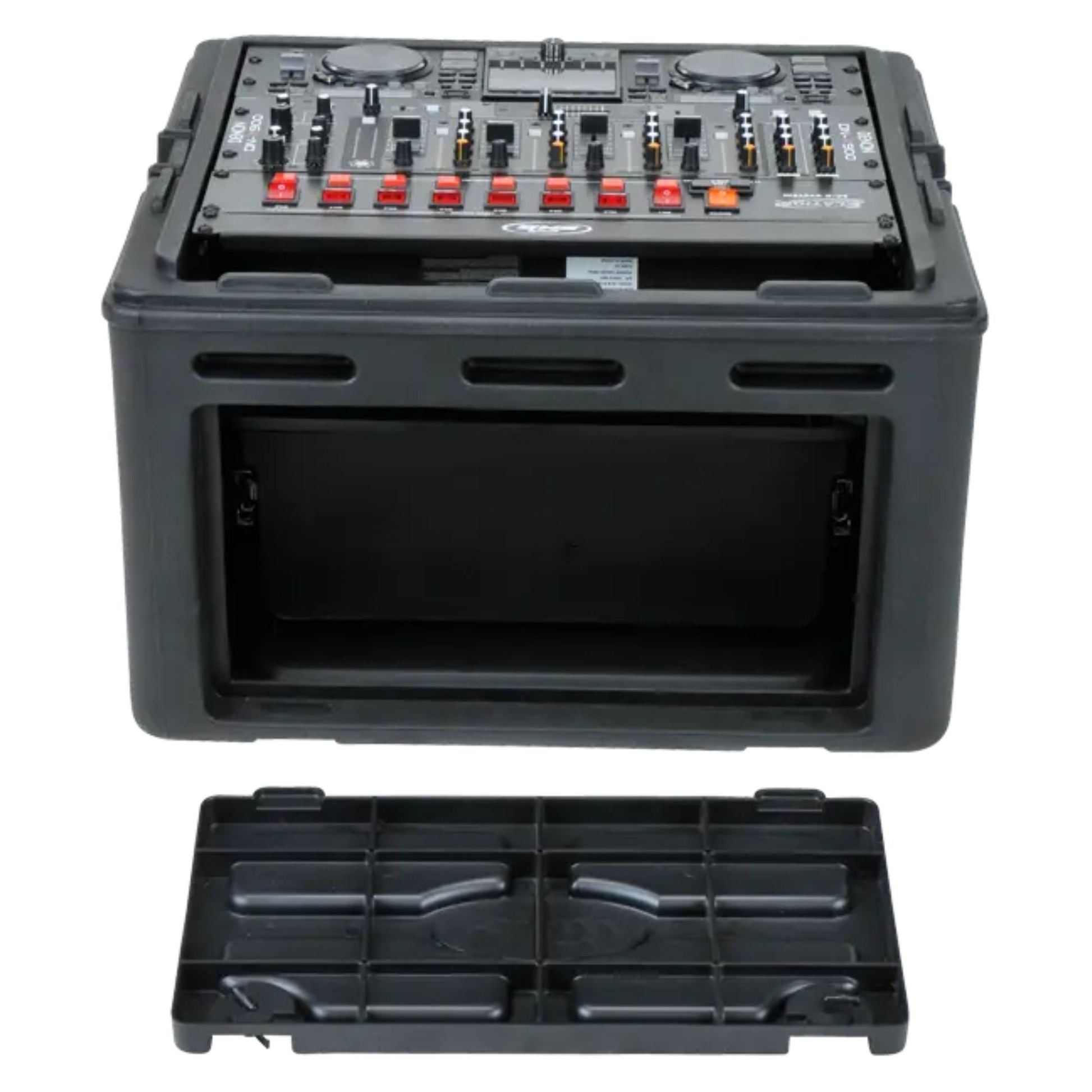 The case is constructed with a one-piece base made from Roto-Molded Linear Medium Density Polyethylene (LMDPE), offering exceptional durability and impact resistance. The front, rear, and top lids are injection molded from Rubber Modified Styrene (RMS), adding further strength while keeping the overall weight manageable. The hard flat top is designed for easy stacking during transport or storage, and the spacious interior allows enough room to mount an optional AV-8 shelf—even with the lid closed.