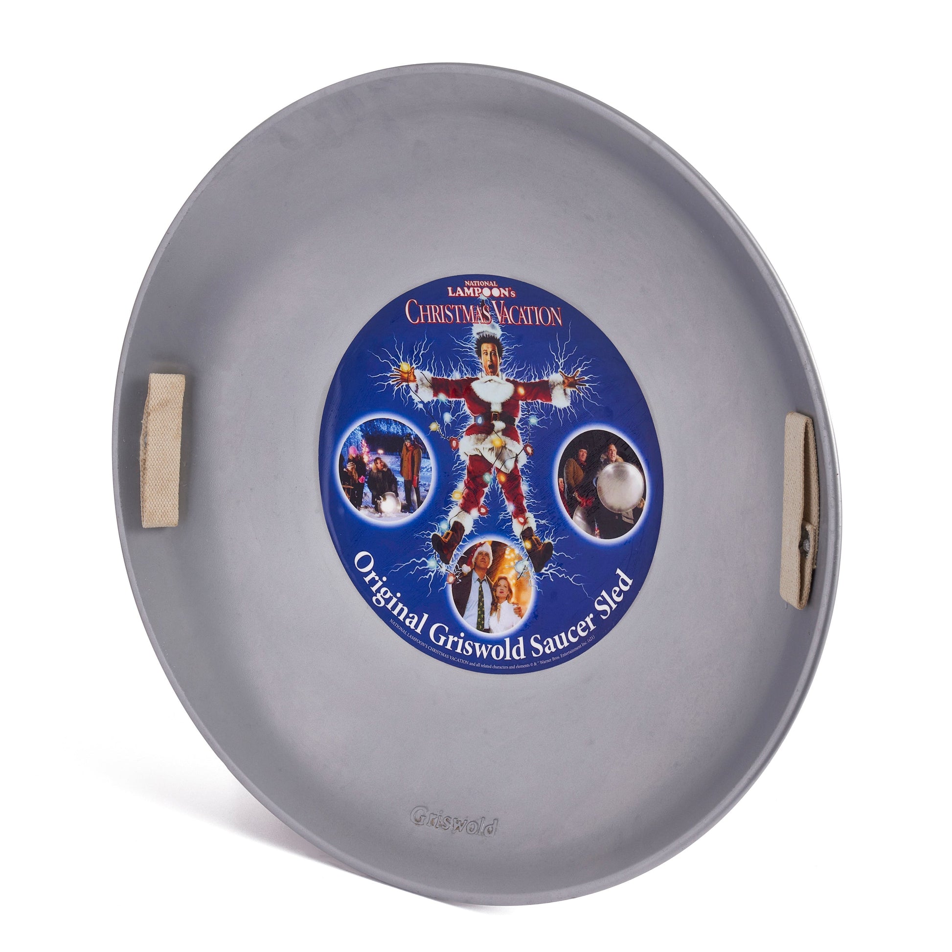 This vintage aluminum saucer snow sled is sure to bring joy to anyone, whether or not they are familiar with the holiday classic film Christmas Vacation. This heavy-duty sled is made from a durable premium grade aluminum alloy that will stand against the weather and repeated use you give this classic saucer sled on the snow-covered hills. The dual riveted soft-grip handles are easy to hold and give the sled an even more original look. This saucer sled is not only a blast to race down the hill at firey fast speeds, but it can also double as a holiday decoration for those die-hard Christmas Vacation fans.
