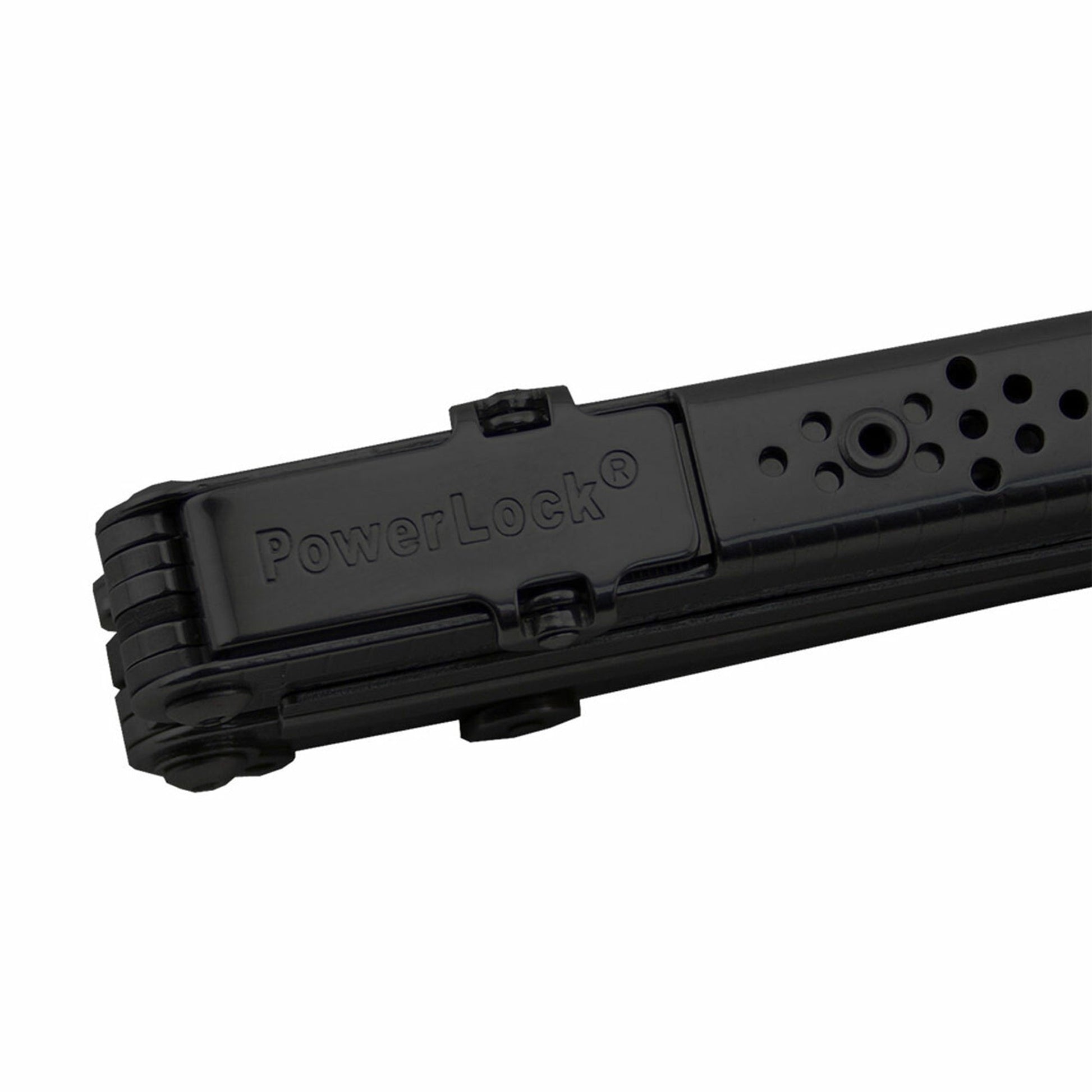 Compound leverage technology in the handle provides extra travel for the pliers, increasing your grip strength. The PowerLock keeps this steel multi-tool and wire cutter secure. This PowerLock features 1-press button locks and releases all tools under the toughest conditions. The multi-tool features tactical pliers, a gripper, a knife, a wood saw, 4 screwdrivers, a ratchet and hex bit driver, a V-cutter, a file, AWL, a can or bottle opener, a wire cutter, crimpers, and a ruler.