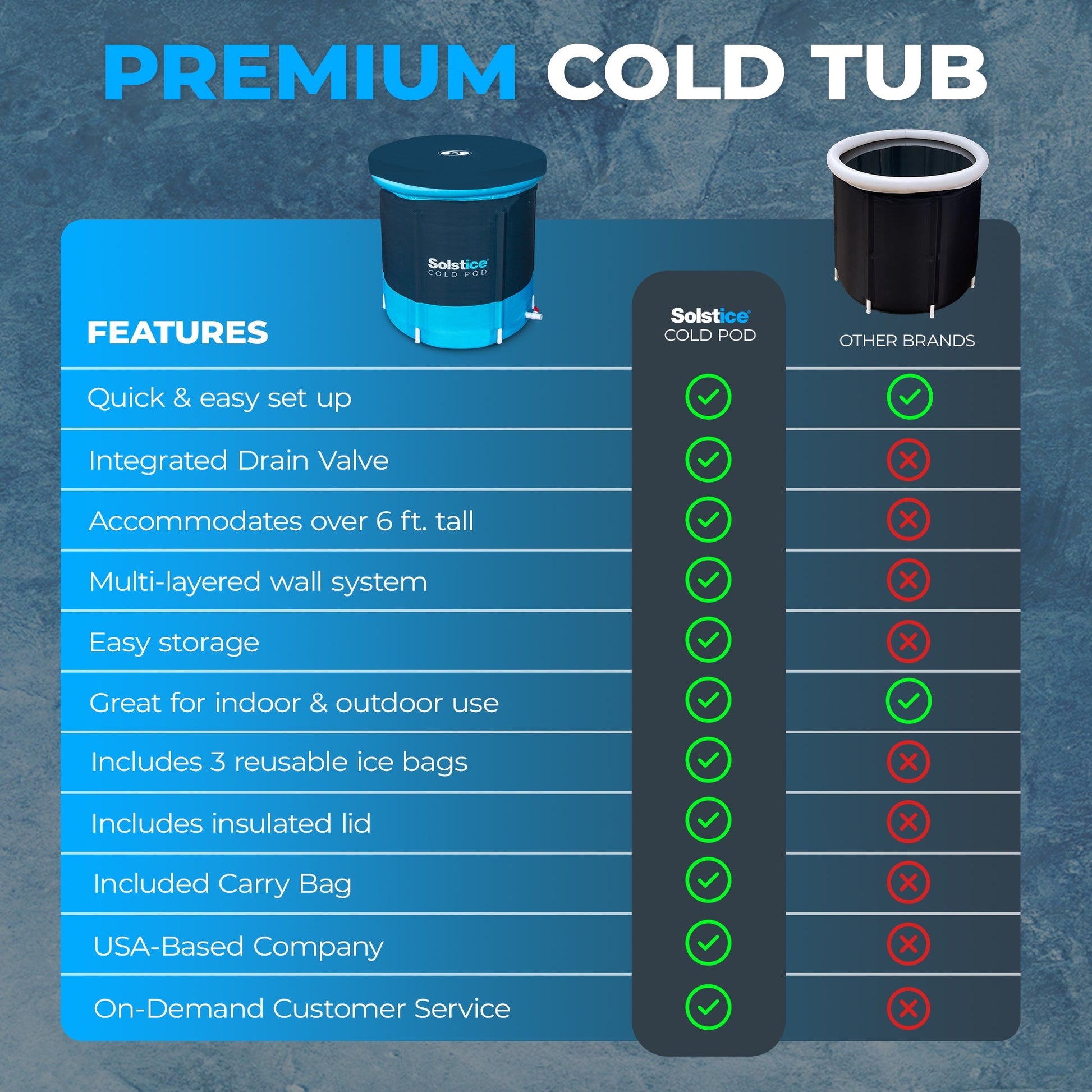 The PORTABLE DESIGN of the Solstice Cold Pod is truly where convenience meets utility. It folds neatly into an included carry bag, making the transition from home to any destination effortless. Whether you're at home or on the go, your recovery routine will remain uninterrupted. Additionally, the DURABILITY & STRENGTH of the Cold Pod can't be overstated. Crafted with durable reinforced threaded walls, it promises a leak-resistant, robust experience, built to endure the demands of regular, intensive use.