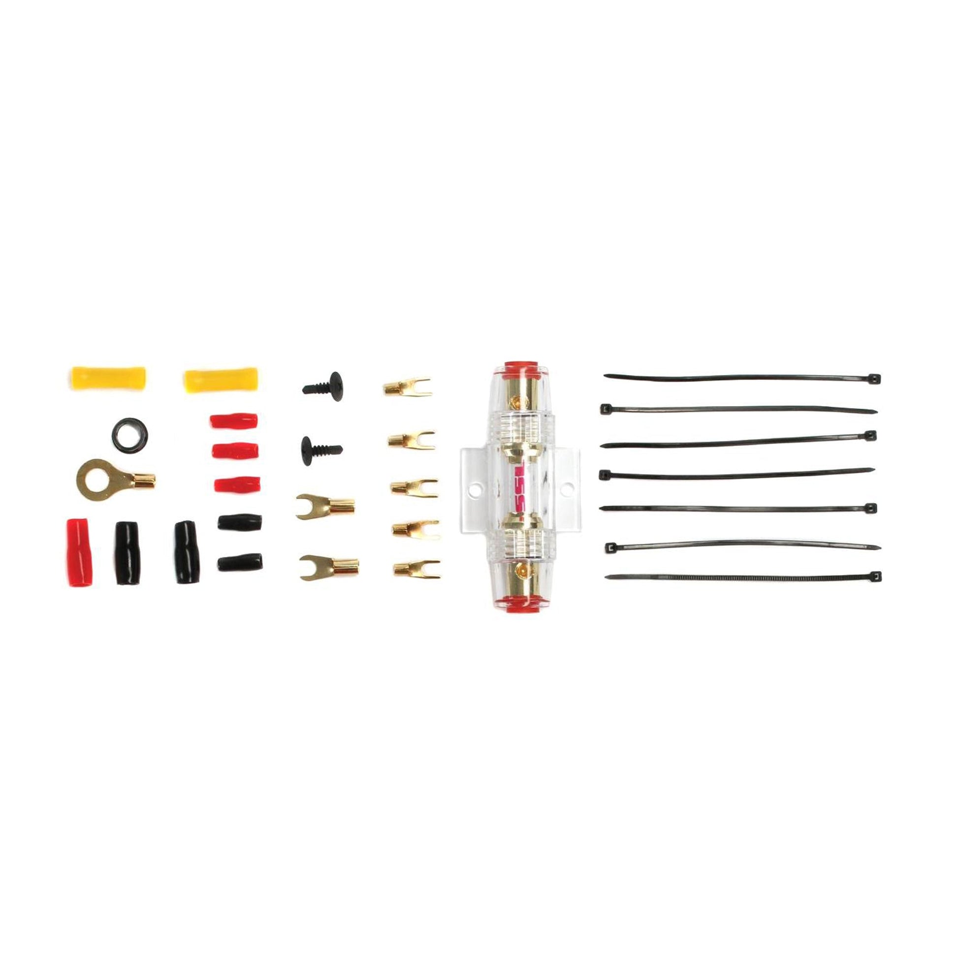 The 8 Gauge amplifier installation kit has everything you need to install your amplifier in your car. Each amp kit features a 20 foot 8 gauge red power cable, competition high-quality fuse holder, 3 feet of 8 gauge black ground cable, 16 feet of 18 gauge blue turn-on wire, a 20-foot high-performance RCA interconnect, 30 feet of speaker wire, 20, 4-inch wire ties, 3, rubber grommets, a Number 10 ring terminal, a 5/16 inch ring terminal, and a 1/4 inch ring terminal.