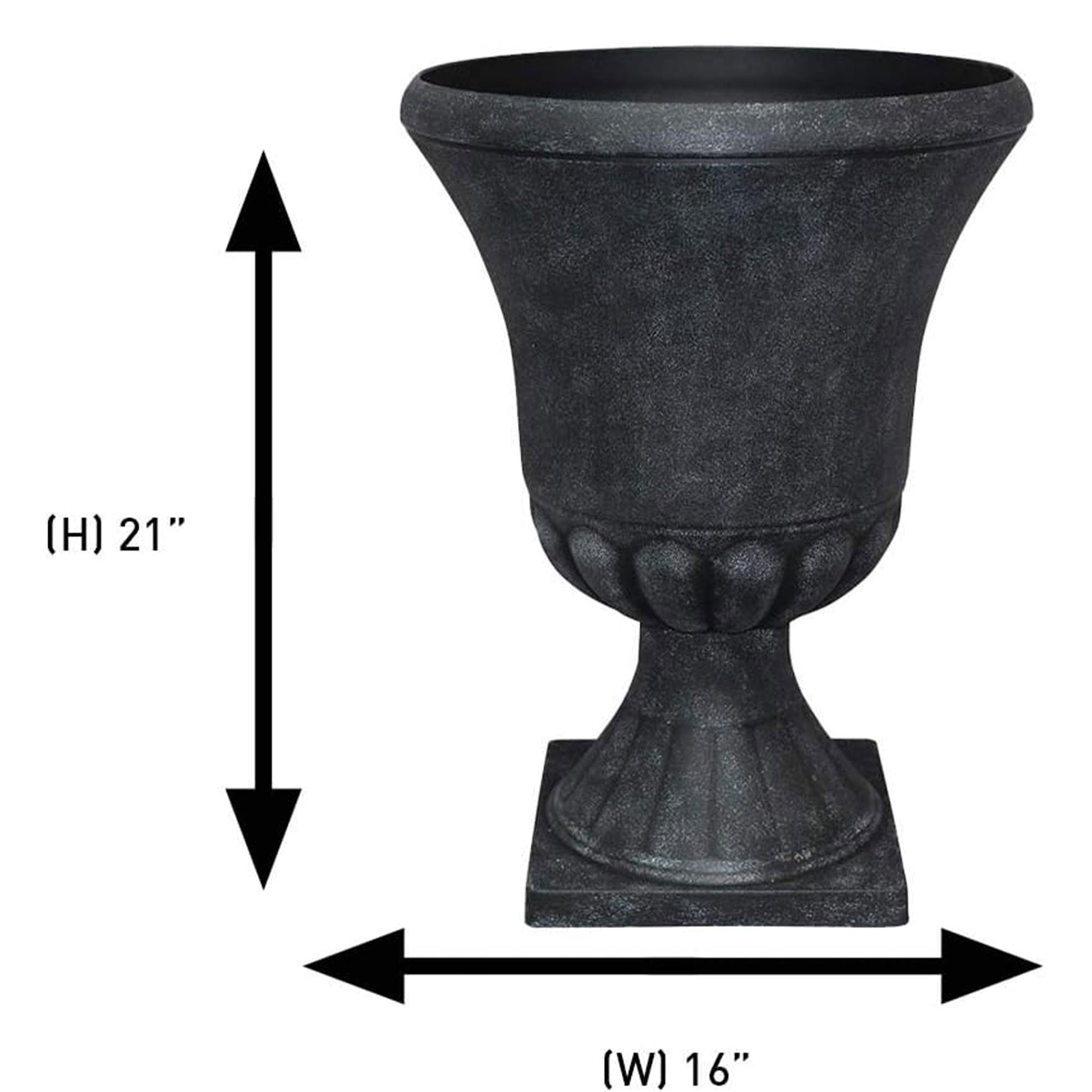This backyard patio urn planter has a classical look with a wide, tapered mouth and molded scalloped details. While it might look like it's made from textured clay, the urn is in fact rendered from resin that mimicks the look of antique urns without the overwhelming weight. A matte black finish adds to the stately look.