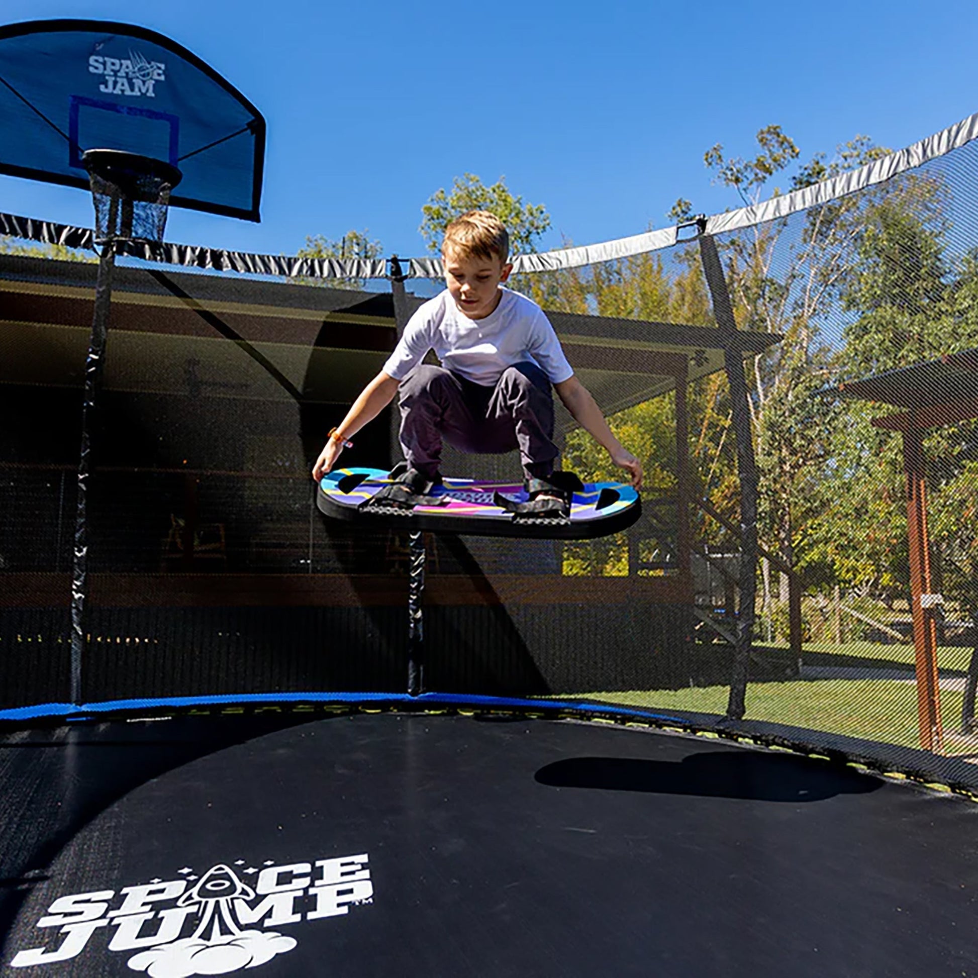 Take backyard adventures to new heights with the SpaceJump HoverBoard Trampoline Accessory, a foam trampoline companion designed for bold bounce tricks and skill-building. This imaginative board lets users lock in their feet using secure hook-and-loop boot straps and launch into safe, freestyle fun. Whether you're working on landings or exploring bounce control, the HoverBoard adds a new challenge and some air to your family trampoline time.