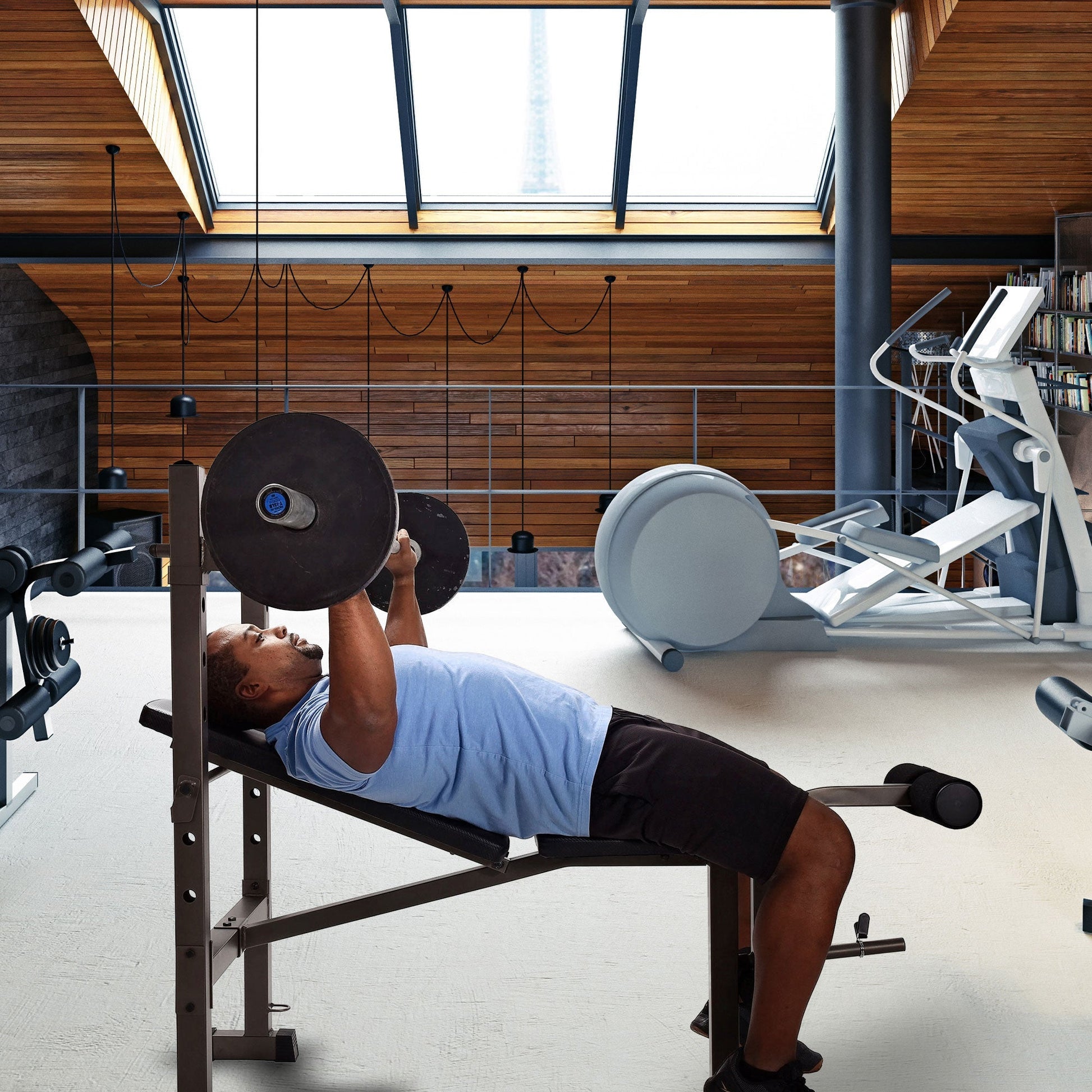 - Versatile weight bench and barbell rack combo with resistance band anchors and Leg Developer for use in home gyms to support your fitness goals