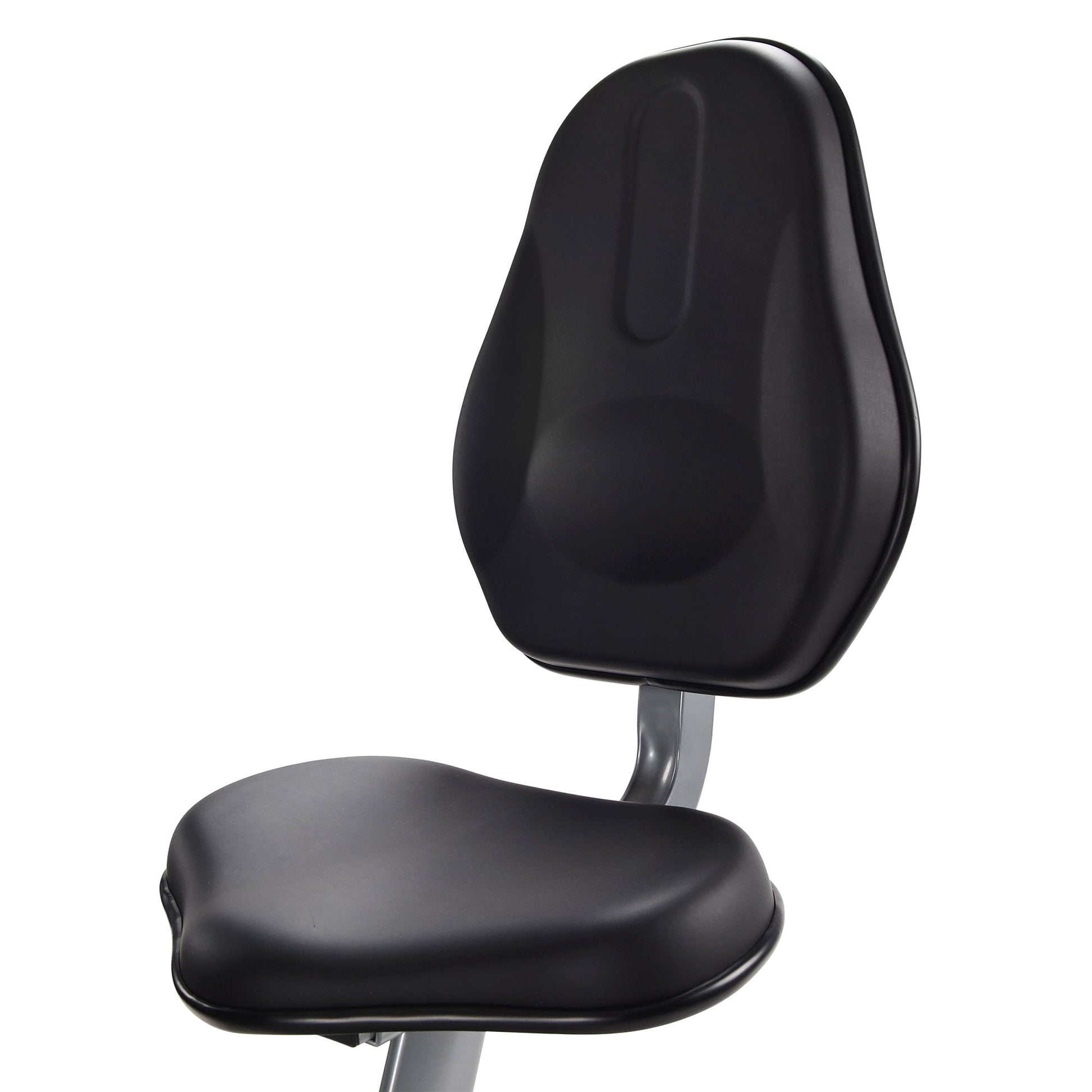 - Includes adjustable and comfortable recumbent seat and backrest, textured pedals, and built-in wheels for easy storage