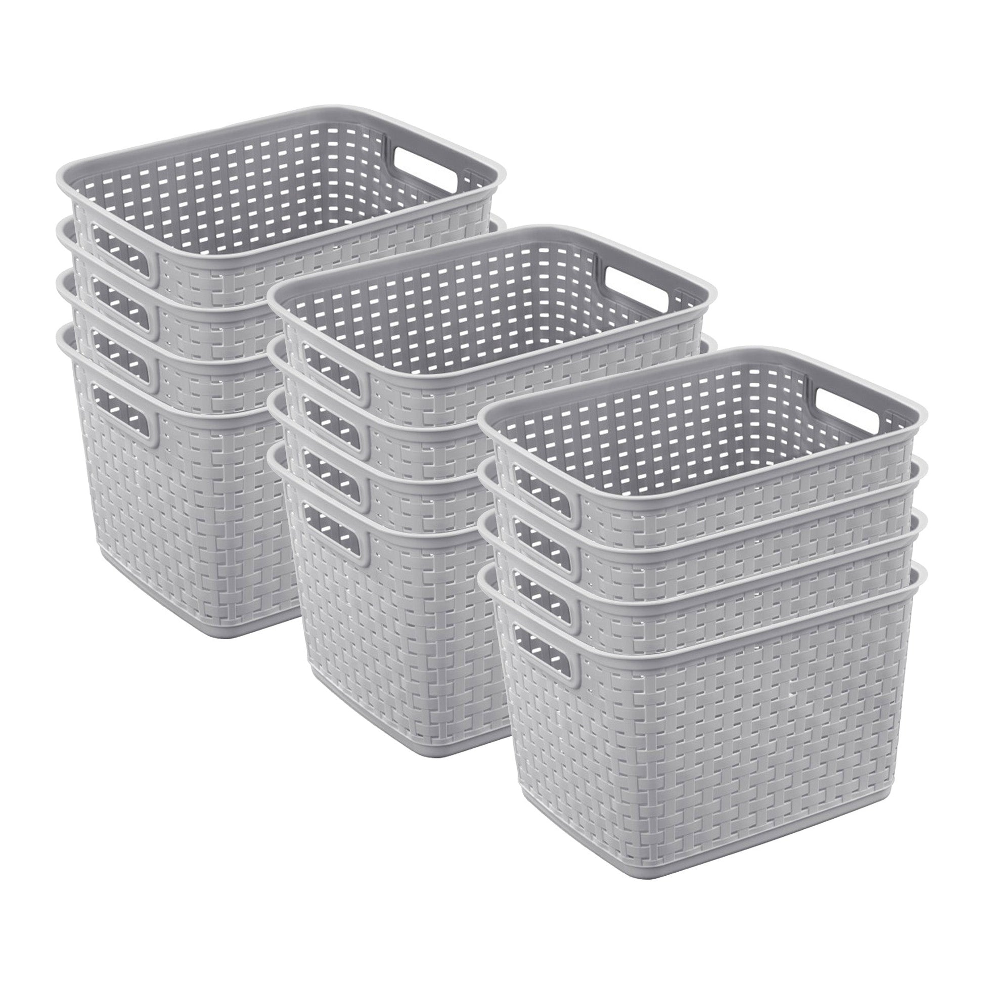 With a woven design that looks just like real wicker, this basket's attractive form and neutral cement gray color make it great for complimenting a wide variety of decors as a functional storage solution. Tidy up the living room or your laundry room with a wicker laundry basket that adds a fashionable touch to your most heavily used spaces. With 15 x 12.25 x 9.375 inches of space, carrying handles, and easy to clean plastic construction, this basket bin gets the job done on your counter tops, in your pantry, on your bookshelves, and elsewhere.