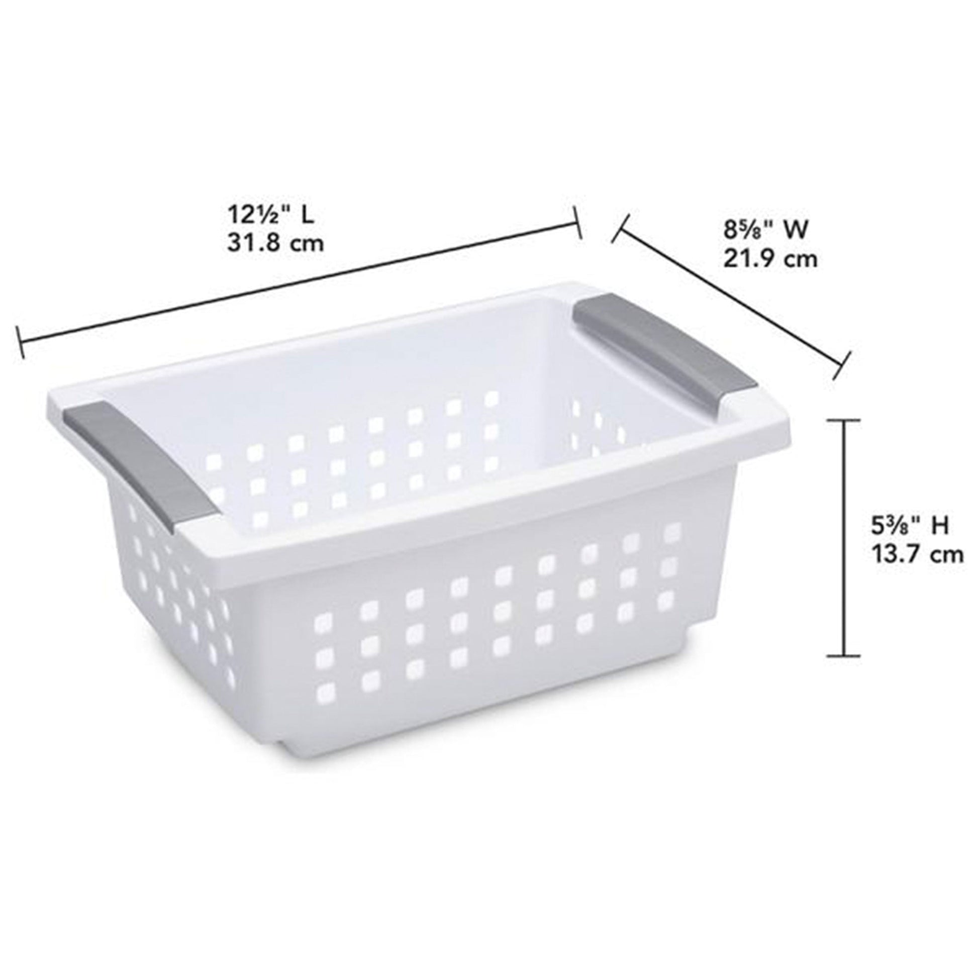Organize your pantry, craft room, or playroom with ease using the Sterilite Small Stacking Storage Baskets with Comfort Grip Handles in White.