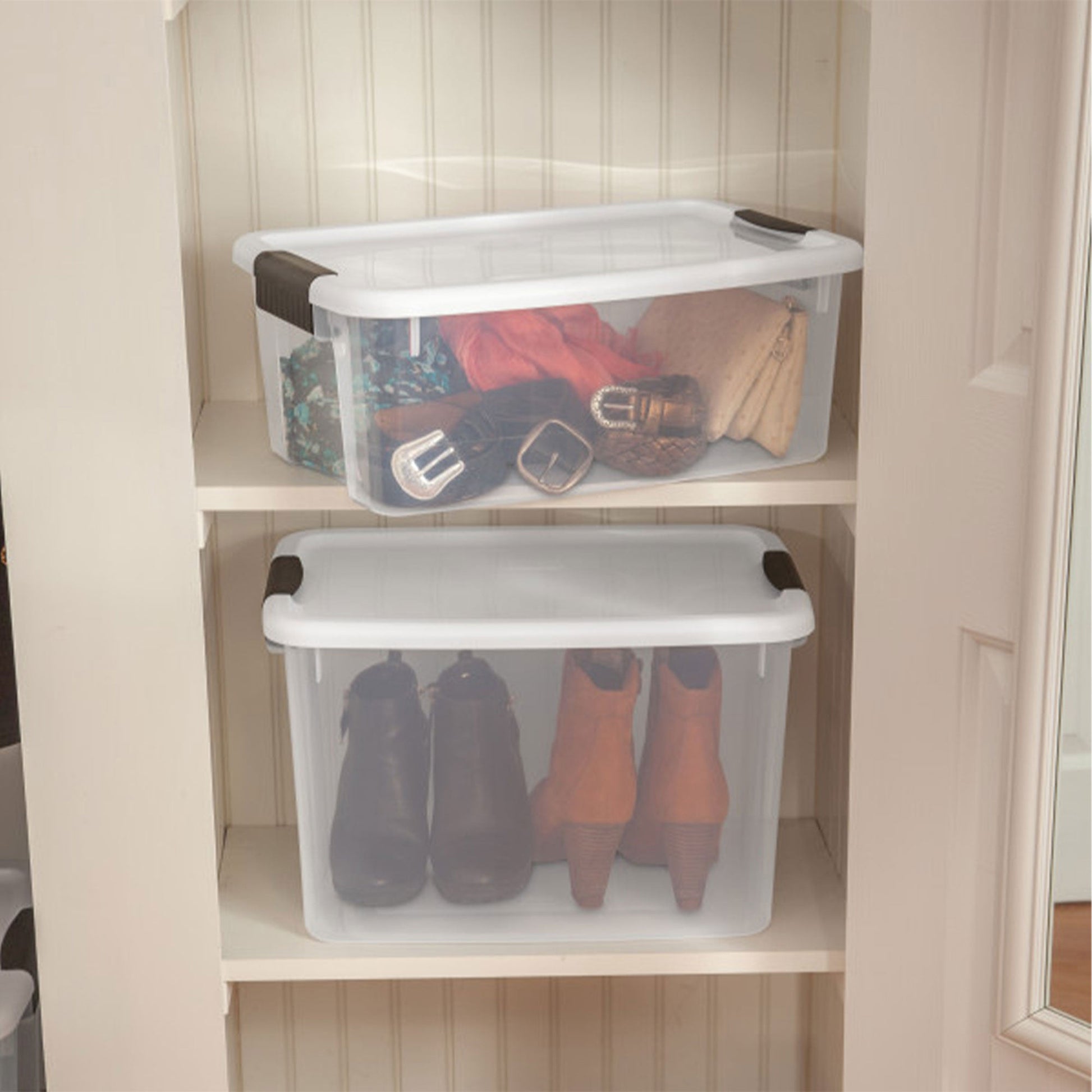 With robust latches that attach the lid securely to the base, you can ensure the contents remain safe while stored. The see-through base allows you to confidently store items of varying sizes, from clothing and bedding to seasonal decorations and household essentials, knowing they'll remain dust-free and organized. The straightforward design of the totes allows for quick and easy identification of their contents, eliminating the need for guessing or rummaging through boxes. The totes are designed to stack on each other, making excellent use of verticle storage space without the hassle of wondering what items are in which tote.