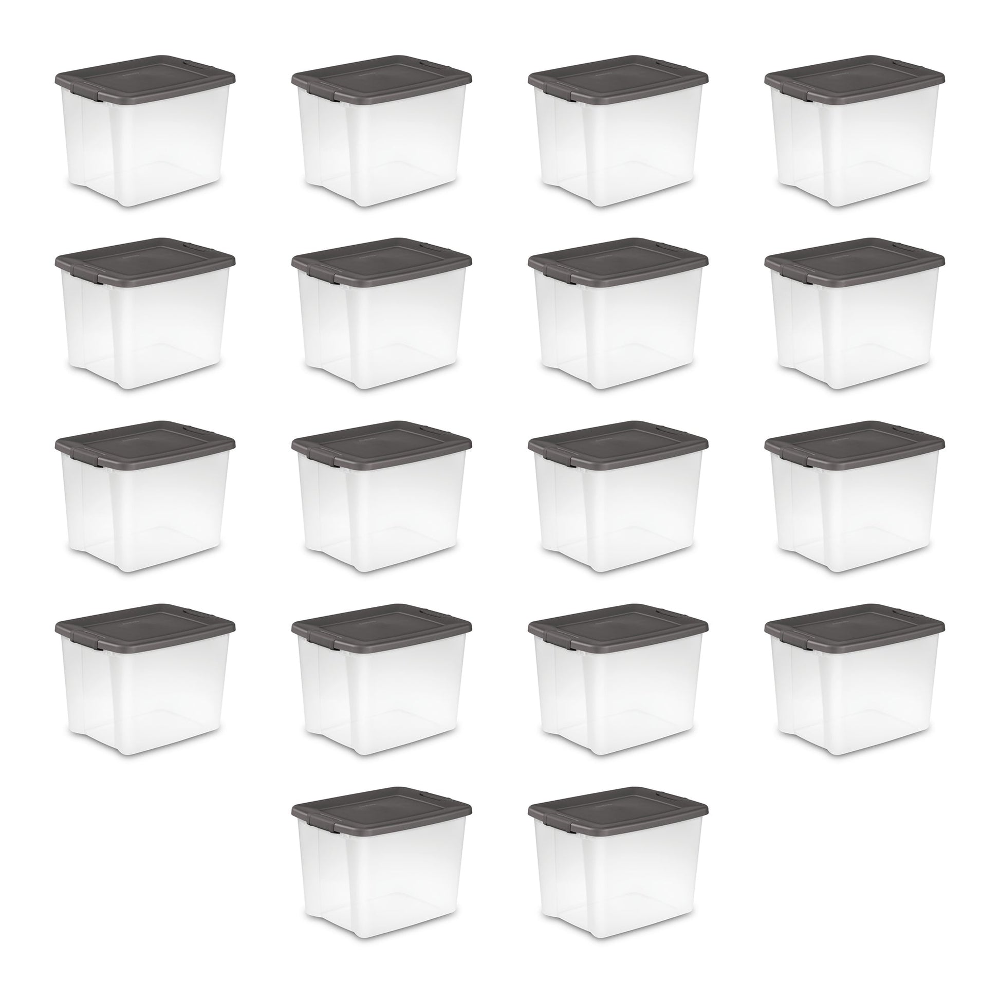 Cut out the clutter in your life with this 18-pack of Sterilite ShelfTotes 50-Quart Clear Latched Plastic Storage Containers. These plastic storage bins can hold up to 50 quarts of your belongings like school projects, clothing, bulk foods, paperwork, and photographs. Thanks to the heavy-duty construction your belongings will remain safely stored.