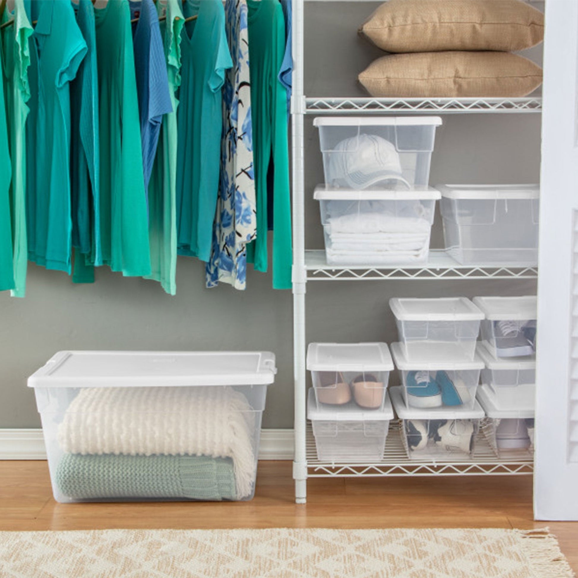 The Sterilite 56-Quart Storage Boxes feature a see-through base that allows contents to be easily identified. Whether you're looking for a specific sweater that's stored away or digging out the holiday decor, these clear boxes make everything easy to locate. The lids snap firmly onto the base to keep contents contained and secure, and its fashionably contoured end panels create recessed handles for easy lifting and transporting. The recessed design of the lids also makes them stackable, proving vertical organization that saves space.