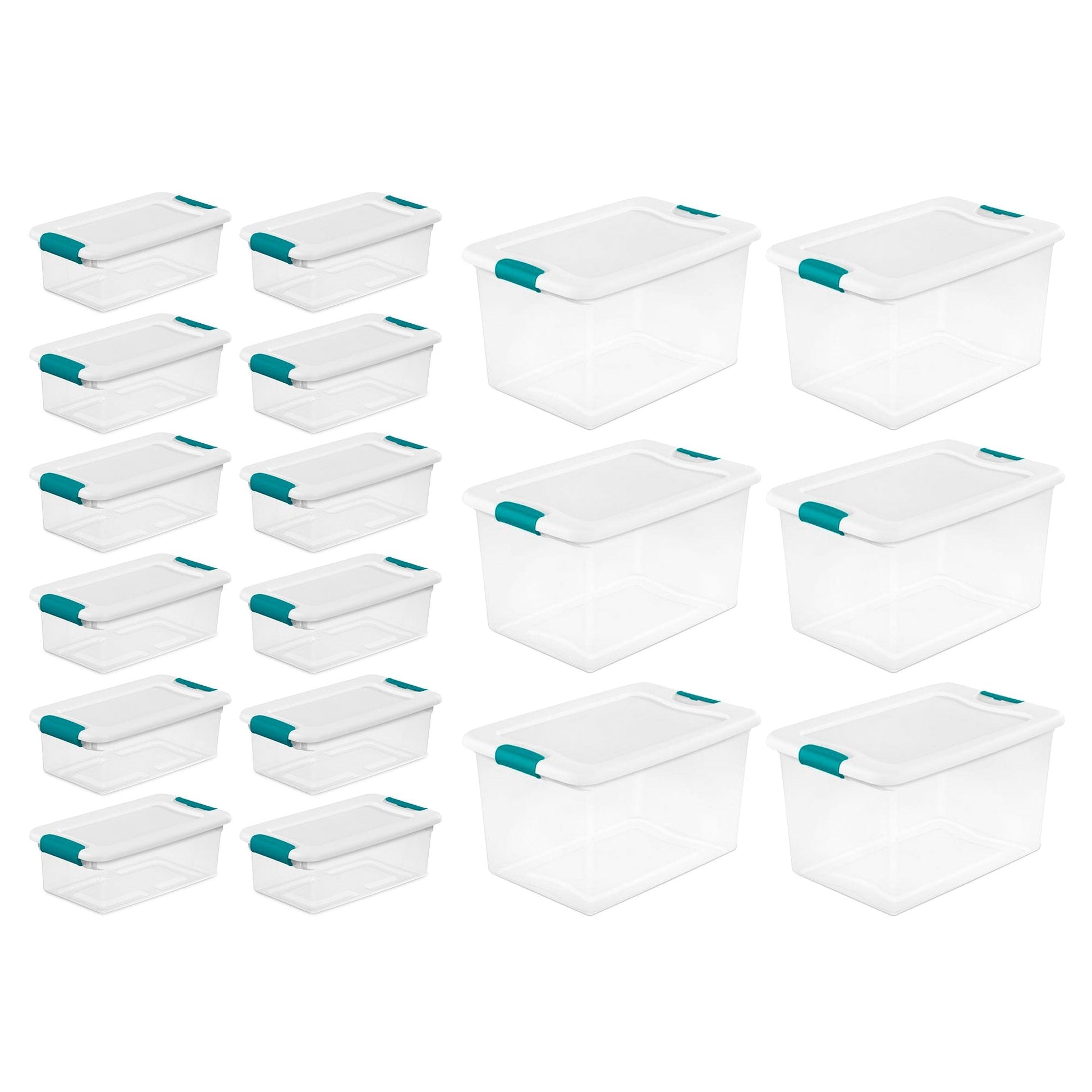 - Set includes: (12) 6-quart totes; (6) 64-quart totes