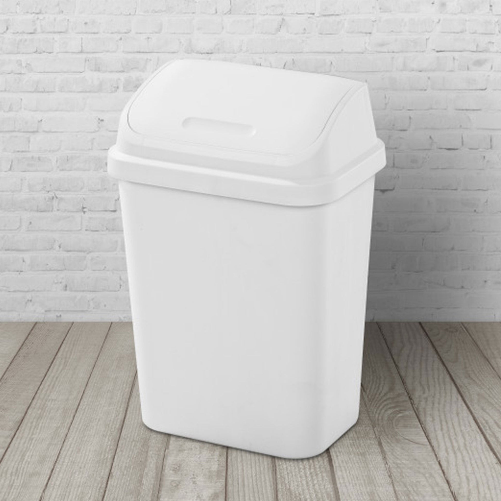 Securely staying upright for your convenience, the lid opens effortlessly with just a touch. Its swing-in feature facilitates easy disposal, complemented by a discreet bag-hiding rim for a tidy look. Built for durability, the wastebasket is designed to withstand the demands of day-to-day use in busy rooms. The contemporary design, square profile, and sleek lines effortlessly enhance any home decor, while the classic white color adds a touch of sophistication. Its mid-sized capacity is perfect for high-traffic areas, accommodating a standard 8-gallon trash liner. Crafted from easy-to-clean plastic with a textured surface, maintenance is a breeze. Versatile and stylish, it's the ideal solution for spaces like the kitchen, bathroom, bedroom, dorm room, mudroom, or basement.