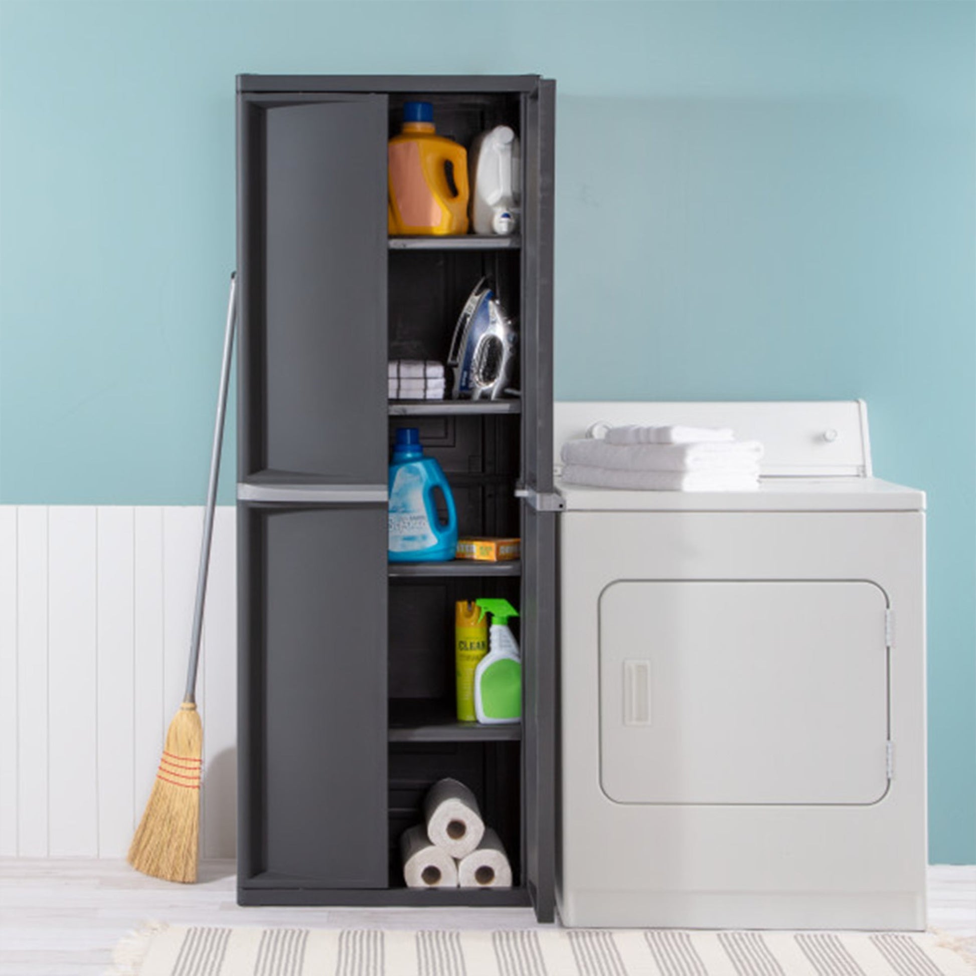 This plastic storage cabinet has 4 adjustable shelves and is large enough to accommodate a plethora of items while keeping them easily within reach. The doors swing in and out easily for easy access and close securely to prevent items from falling out.